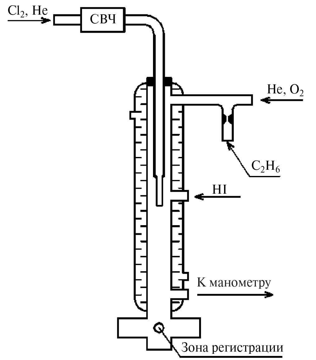 Реактор (рис. 1) представлял собой кварцевый цилиндр, внутренняя поверхность которого была покрыта веществом марки Ф-32Л для того, чтобы уменьшить скорость гетерогенной гибели атомов и радикалов. Реактор имел водяную рубашку, что позволяло изменять в нем температуру. Давление в реакторе измеряли с помощью манометра ВДГ-1 в диапазоне 1÷10 Торр с точностью ~0.1Торр. Газы-разбавители (гелий или азот), а также HI подавались в реактор через боковые отверстия. Для подачи газов-разбавителей в реактор использовали регуляторы расходов, позволяющие поддерживать постоянный расход газа с точностью 2÷3% в течение 10÷15 ч.