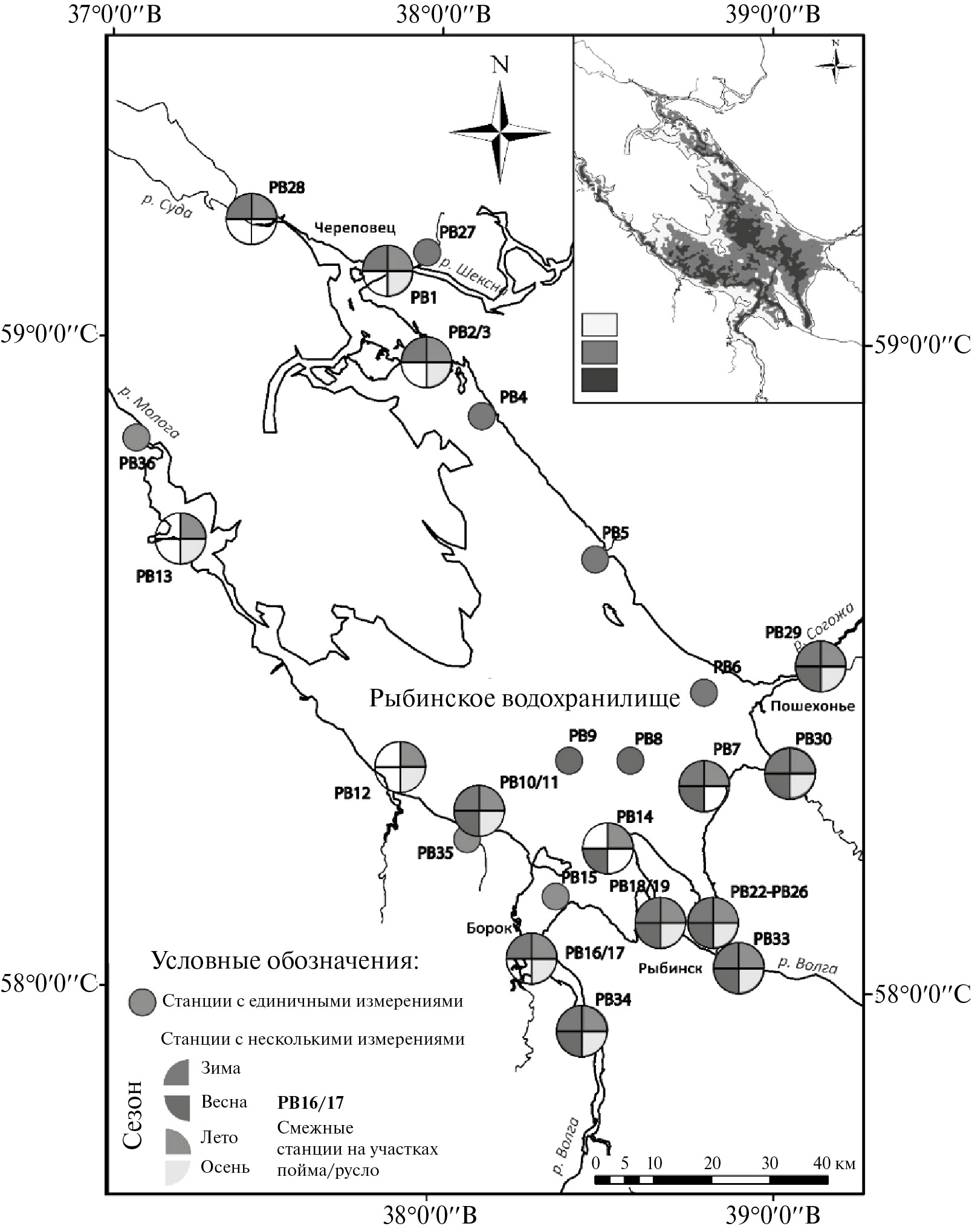 Всего выполнен отбор проб воды и воздуха на 71 станции для определения концентрации метана, который совмещался с зондированием водной толщи и отбором проб донных отложений. В результате была создана сеть опорных станций, на которых производятся регулярные измерения, а также дополнительные станции на акватории и в устьях рек. Для контроля уровня дегазации при проходе воды через плотину отбираются пробы воды на гидроагрегатах ГЭС, а также ниже плотины Шекснинской ГЭС в черте г. Рыбинск (рис. 1).