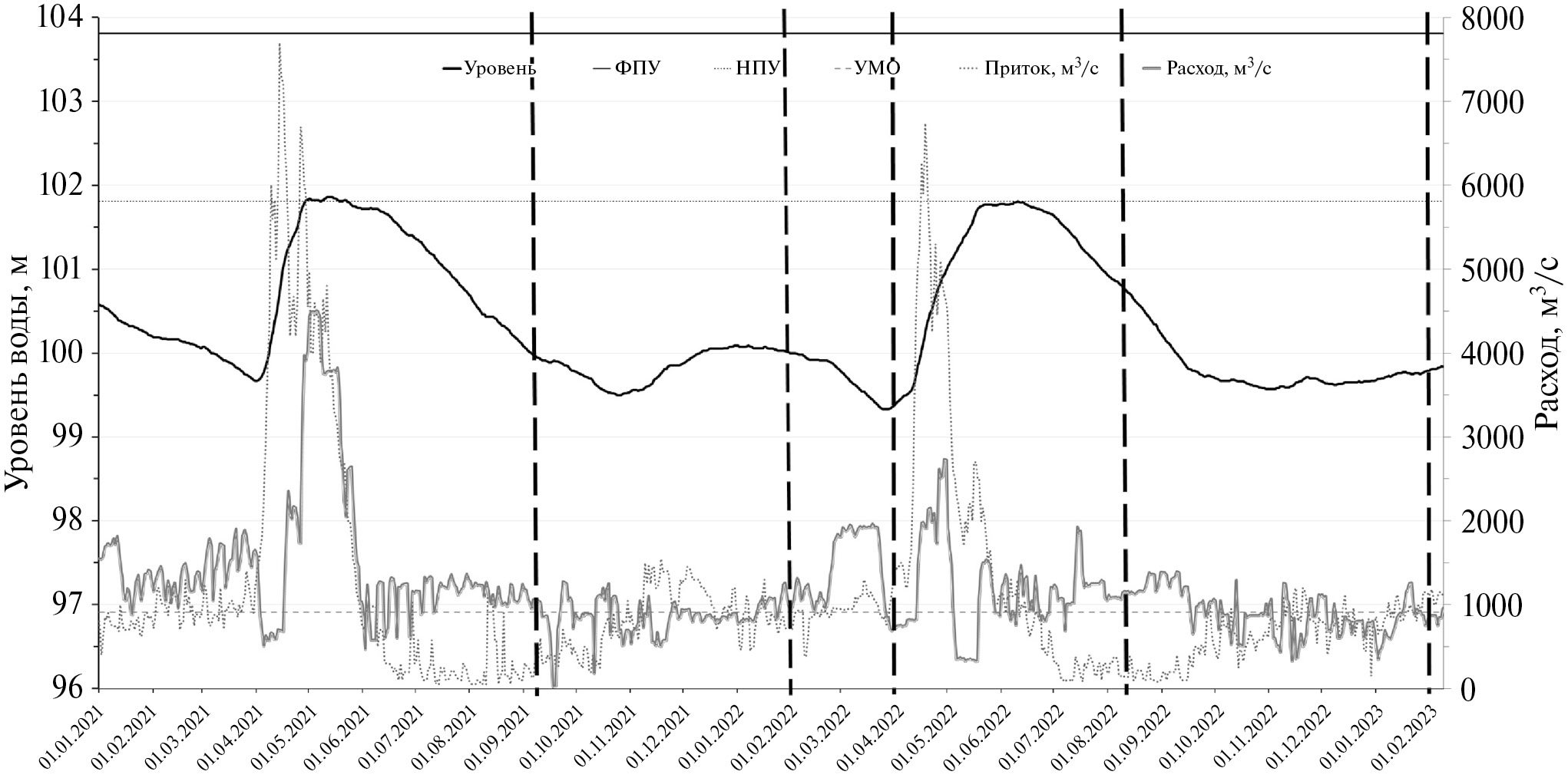 Изменение уровней воды, притока и расхода за весь анализируемый период (сентябрь 2021 г. – февраль 2023 г.) по данным Русгидро приведено на рис. 3. Зимние съемки приурочены к периоду наибольшей сработки (особенно в конце марта 2022 г.). Наблюдения в августе 2022 г. соответствуют достаточно высокому положению уровню воды в водохранилище. Сравнение данных наблюдений за уровнем воды по посту Мякса за последние три года свидетельствуют о том, что режим уровней воды близок к среднемноголетним условиям в период наполнения водохранилища и значительно большей (примерно на 0,5 м) сработки в летне-осенний и зимний период.