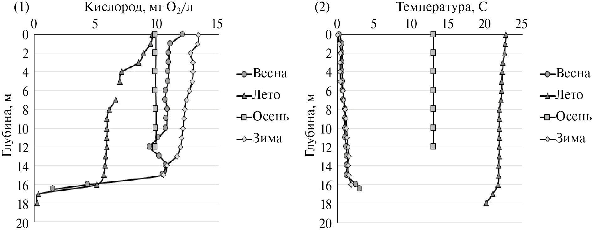В качестве примера сезонных изменений распределения температуры и содержания кислорода на вертикали можно рассмотреть наиболее глубокие станции в Волжском плёсе (РВ18) и в районе д. Ивановское (РВ7). Обе станции находятся над затопленными руслами рек. Измерения на станции РВ18 производились во все рассматриваемые периоды, а в районе РВ7 весной, летом и зимой 2022 года.
