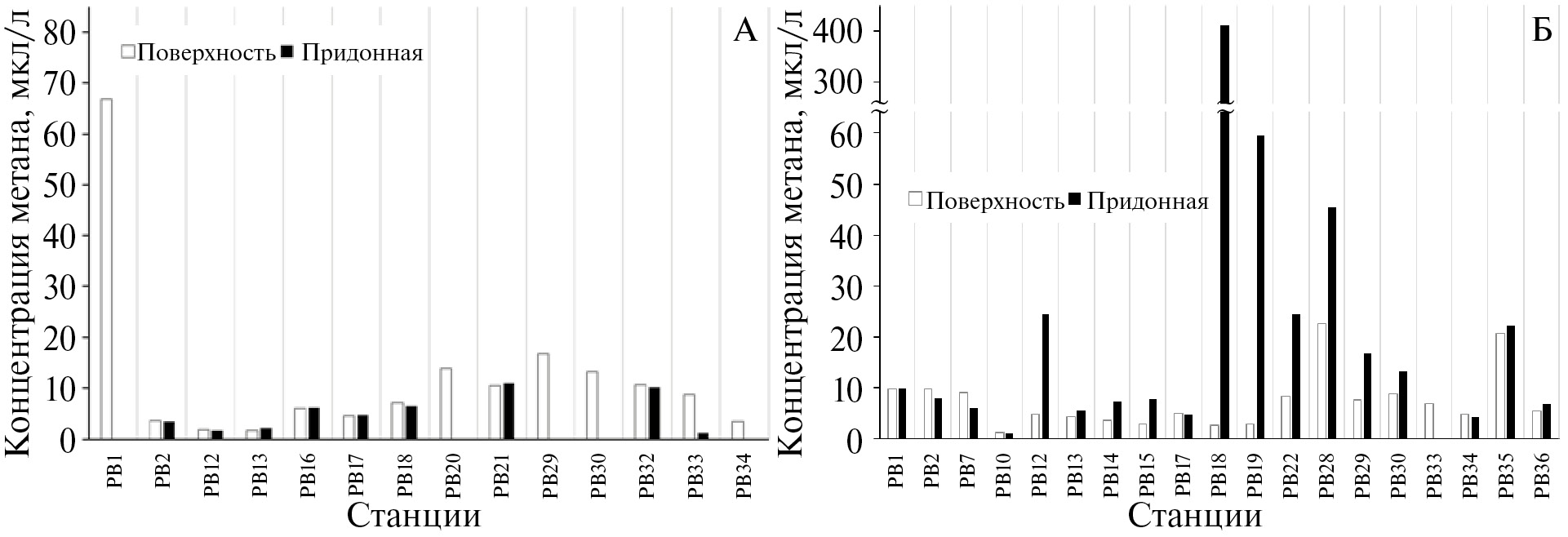 Рис. 9. Содержание метана на станциях измерений в поверхностном и придонном горизонтах в осенний (А) и летний (Б) сезоны.