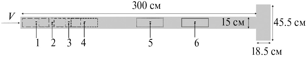 Рис. 1. Схема ветро-волнового канала (вид сверху). 1, 2, 3, 4, 5, 6 – места измерения полей скорости в воде в вертикальной плоскости и скорости ветра термоанемометром РСУ-423 на высоте 1.7 см от уровня невозмущённой поверхности; прямоугольниками обозначены области измерения поля температуры и рельефа поверхности