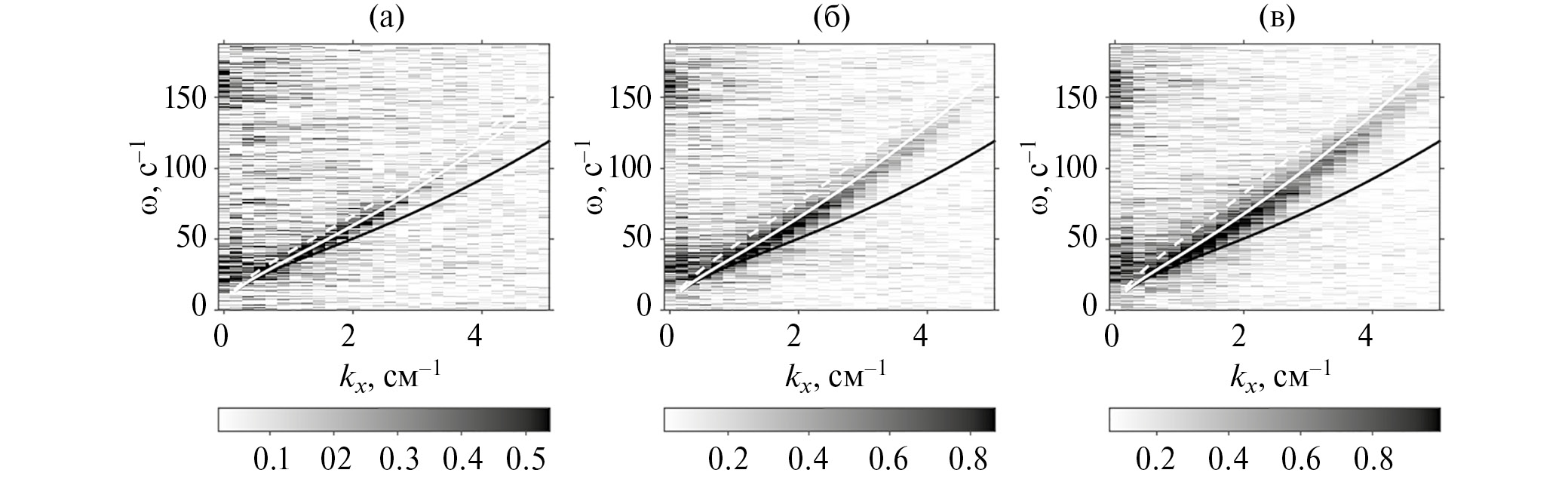 Рис. 8. Зависимость дисперсионного соотношения от расстояния x от начала канала для воды с добавлением SDS: а – x = 40 см, vair = 2.60 м/с, U0 = 16.0 см/с; б – x = 60 см, vair = 2.60 м/с, U0 = 17.7 см/с; в – x = 80 см, vair = 2.44 м/с, U0 = 18.3 см/с. Черная кривая – расчет по формуле (10), пунктирная – расчет по формуле (11), светлая кривая – расчет с учетом профиля скорости. Цветовые шкалы показывают десятичные логарифмы амплитуды спектральной плотности