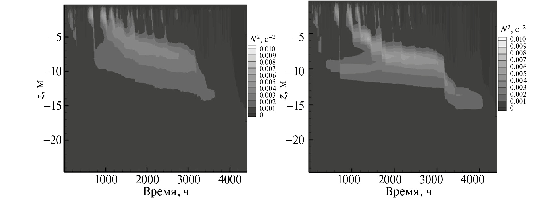 Были сопоставлены временные ряды вертикального распределения квадрата частоты плавучести N2. Результаты расчетов для комбинаций (б) и (в) оказались визуально идентичны, поэтому комбинацию (в) не приводим. Результаты для (а) и (б) приведены на рис. 2 и 3.