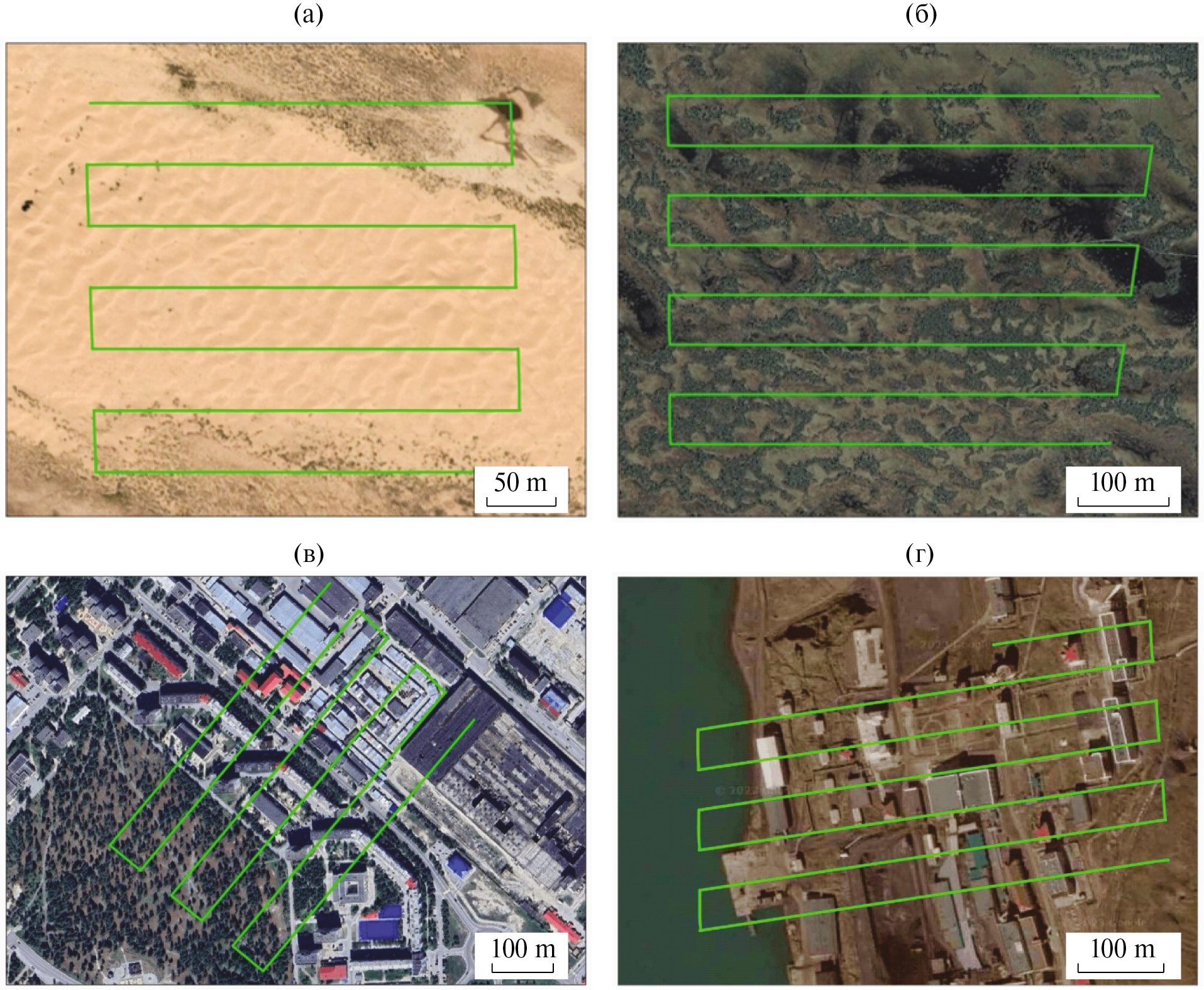 Рис. 1. Спутниковые снимки четырех полигонов, для которых выполнялась термическая съемка: песчаные барханы в районе пос. Нарын-Худук (а), верховое болото в районе исследовательской станции Мухрино (б), центральная часть г. Надым (в), пос. Баренцбург (г). Зеленым цветом показаны маршруты полета квадрокоптера над данными полигонами во время съемки