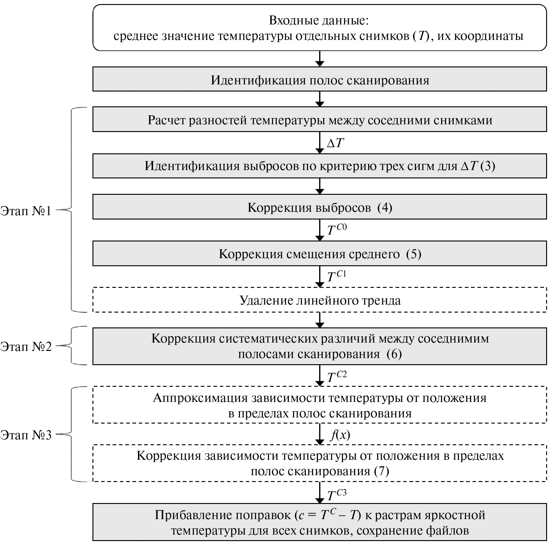 Для устранения подобных артефактов предложен алгоритм коррекции, состоящий из нескольких этапов (рис. 3). На всех этапах анализируются и корректируются значения средней температуры каждого снимка Ti. На первом этапе осуществляется коррекция резких скачкообразных изменений температуры соседних снимков. Для этого вначале рассчитываются разности значений средних температур соседних снимков ΔTi = Ti – Ti–1, и характеристики статистического распределения их значений ΔT, и на основе критерия трех сигм определялись выбросы в ряду значений ΔT: