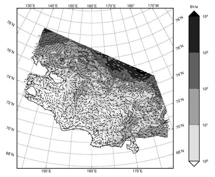 Близкая ситуация в смысле структуры поля отмечается и для среднего (за приливный цикл) интегрального по глубине горизонтального волнового потока бароклинной приливной энергии (рис. 5). Как и для адвективного переноса, для горизонтального волнового потока характерно сочетание упорядоченного переноса и отдельных «круговоротов» в окрестностях о. Новая Сибирь и о-вов Большой и Малый Ляховский. Максимальное значение переменной обнаруживается в окрестности северо-западной и северо-восточной частей открытой границы моря, где оно превышает 103 Вт/м, минимальное – в окрестности континента, где оно меньше 10 Вт/м. Среднее (за приливный цикл и по площади моря) значение горизонтального волнового потока составляет 269 Вт/м.