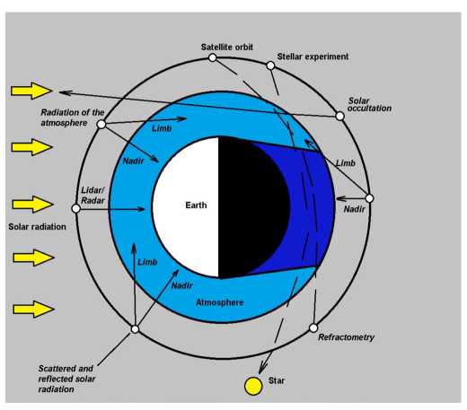 Рис. 2 Примеры дистанционных спутниковых методов измерений и их геометрии.