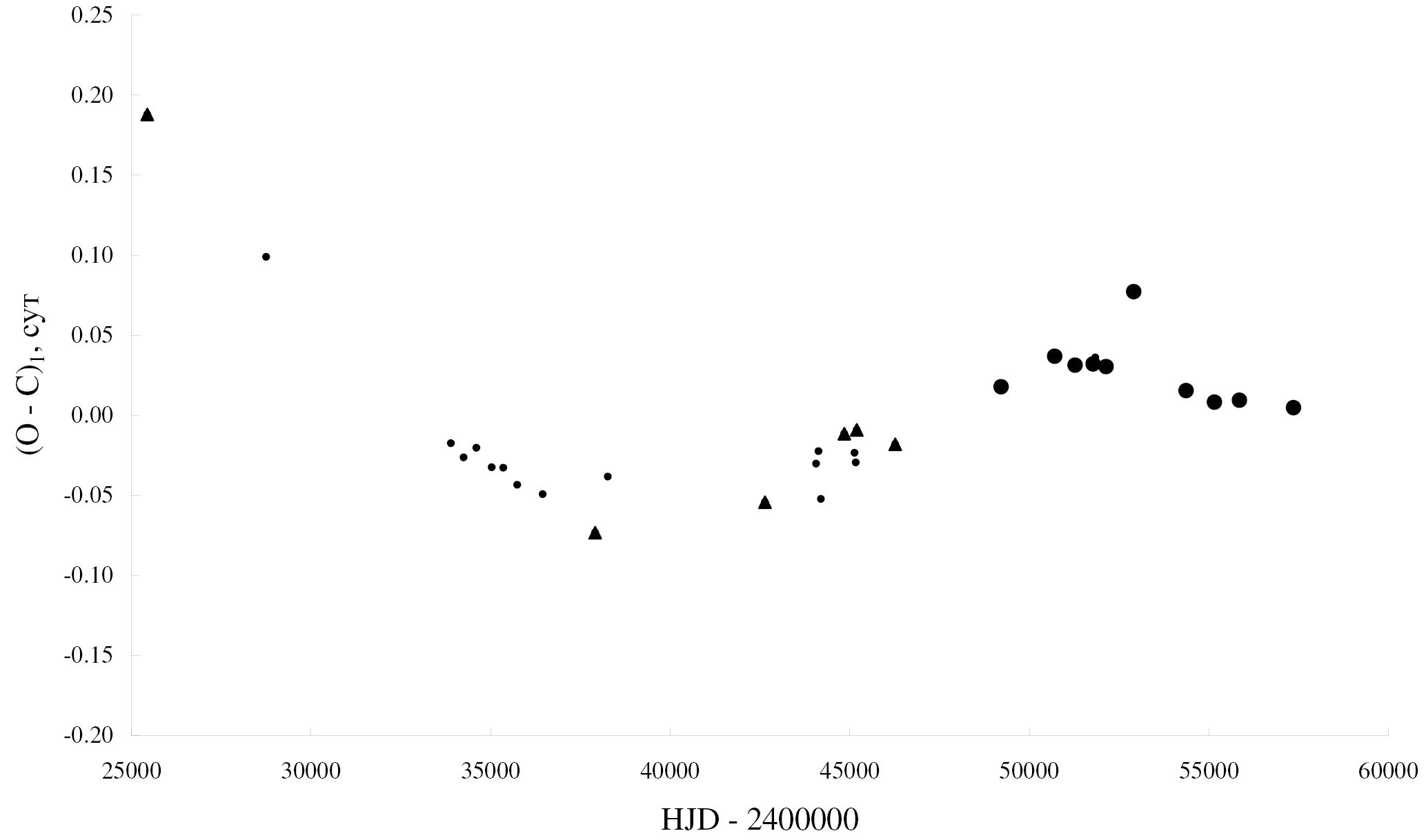 где T — эпоха наблюдения. На этом рисунке фотографические точки представлены в виде треугольников, визуальные наблюдения — маленькими точками, фотоэлектрические и из ПЗС-наблюдений — большими точками. Через эти точки можно провести три прямые. Таким образом, имеется три промежутка времени, в течение которых период остается неизменным: