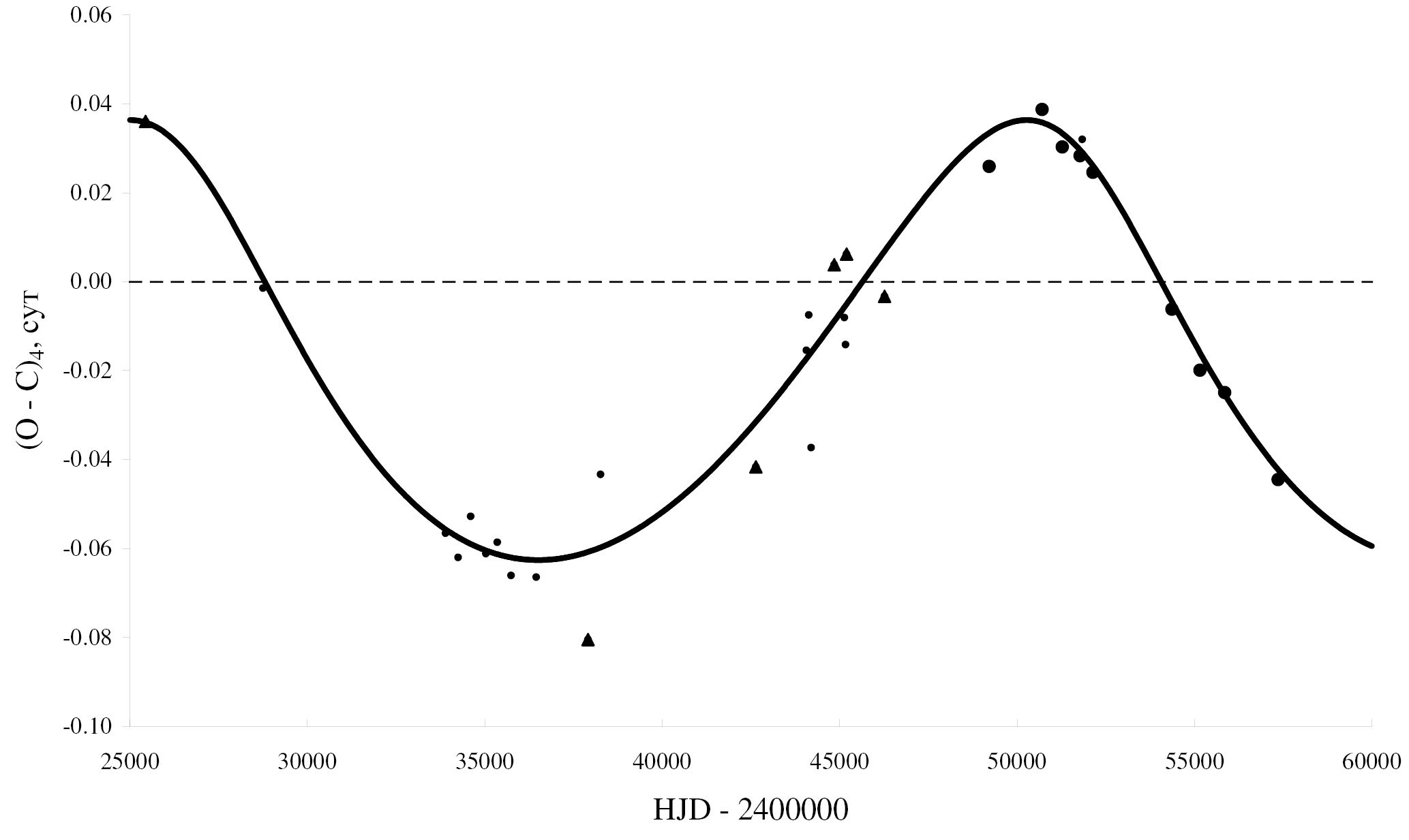 Циклические изменения орбитального периода, прежде всего, можно интерпретировать как движение в долгопериодической орбите с параметрами, приведенными в табл. 6. Массу третьего тела можно оценить, вычислив функцию масс: f (M₃) = 0.135Me. Используя приведенные выше оценки масс компонентов затменно-двойной системы, находим минимальное значение массы третьего тела M₃ = 1.33Me. Из оценок относительных светимостей и масс компонентов из [9] и соотношения масса-светимость в соответствующем диапазоне масс [21] можно оценить светимости компонентов двойной и третьего тела (при условии, что третье тело — звезда Главной последовательности): L₁ ≈ 44Le, L₂ ≈ 6.6Le, L₃ ≈ 3.4Le и вклад третьего тела в общую светимость системы L₃ /(L₁ + L₂ + L₃) ≈ 0.07. Таким образом, вклад третьего тела в светимость системы должен составлять не менее 7% и его можно было бы обнаружить из наблюдений кривой блеска.