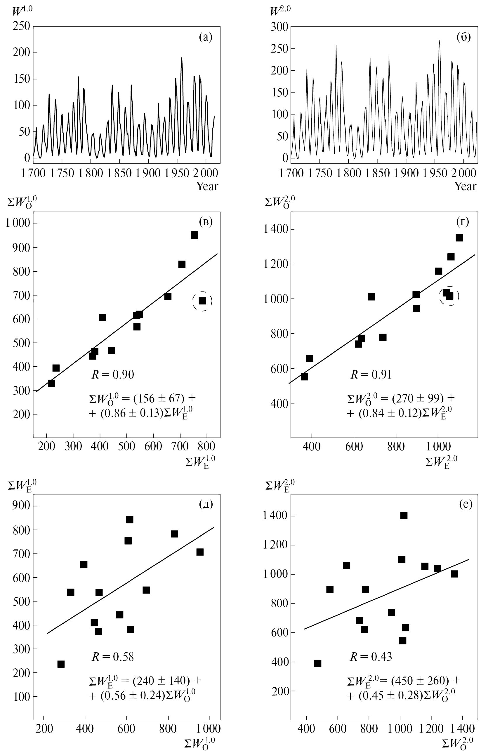 Как и ранее, обозначим нижним индексом Е параметры (3) для четных циклов, О — для нечетных, на месте верхнего индекса обозначим номер версии чисел Вольфа. Произведя расчет для зависимостей, приведенных на рис. 1, получаем