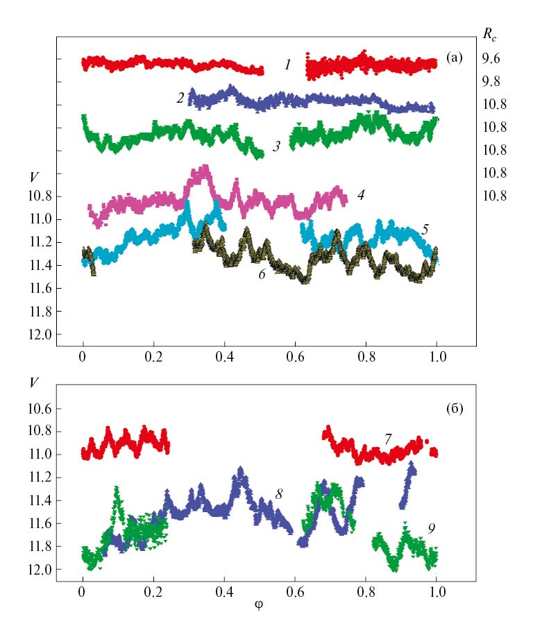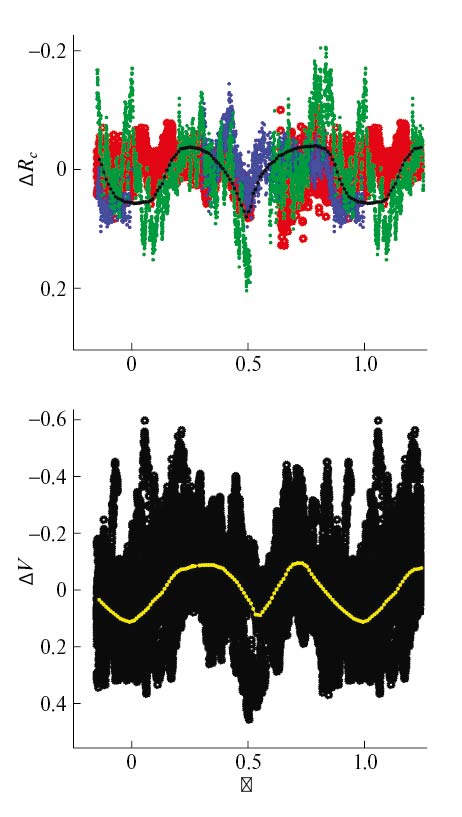 Поскольку средний уровень блеска системы меняется со временем (до 2m по нашим наблюдениям, см. табл. 2), на первом этапе для каждого из 22 сетов наблюдений в фильтре V и 3 сетов в фильтре Rc мы определили средний уровень блеска. Его значение приведено в 7-м столбце табл. 2.