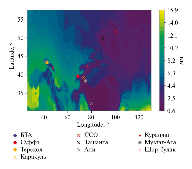 В пределах рассматриваемого макрорегиона наименьшие значения осажденного водяного пара соответствуют достаточно протяженной области, вытянутой преимущественно с юга на север вдоль 73 в. д. Южнее озера Каракуль расположены два астропункта Музтаг-Ата (38.33° c. ш., 74.90° в. д., 4526 м над уровнем моря) и Али (32.30° c. ш., 80.05° в. д., 5050 м над уровнем моря), для которых в настоящее время проводятся детальные натурные астроклиматические исследования атмосферы [29]. Эти астропункты характеризуются высокой повторяемостью атмосферных ситуаций, когда осажденной водяной пар по величине составляет менее 2 мм. Анализируя распределения атмосферных характеристик, можно отметить, что астропункт Али выглядит предпочтительнее других мест расположения (где организованы измерения) с точки зрения покрытия неба облачностью и содержания водяного пара в атмосфере в холодный период года [28].
