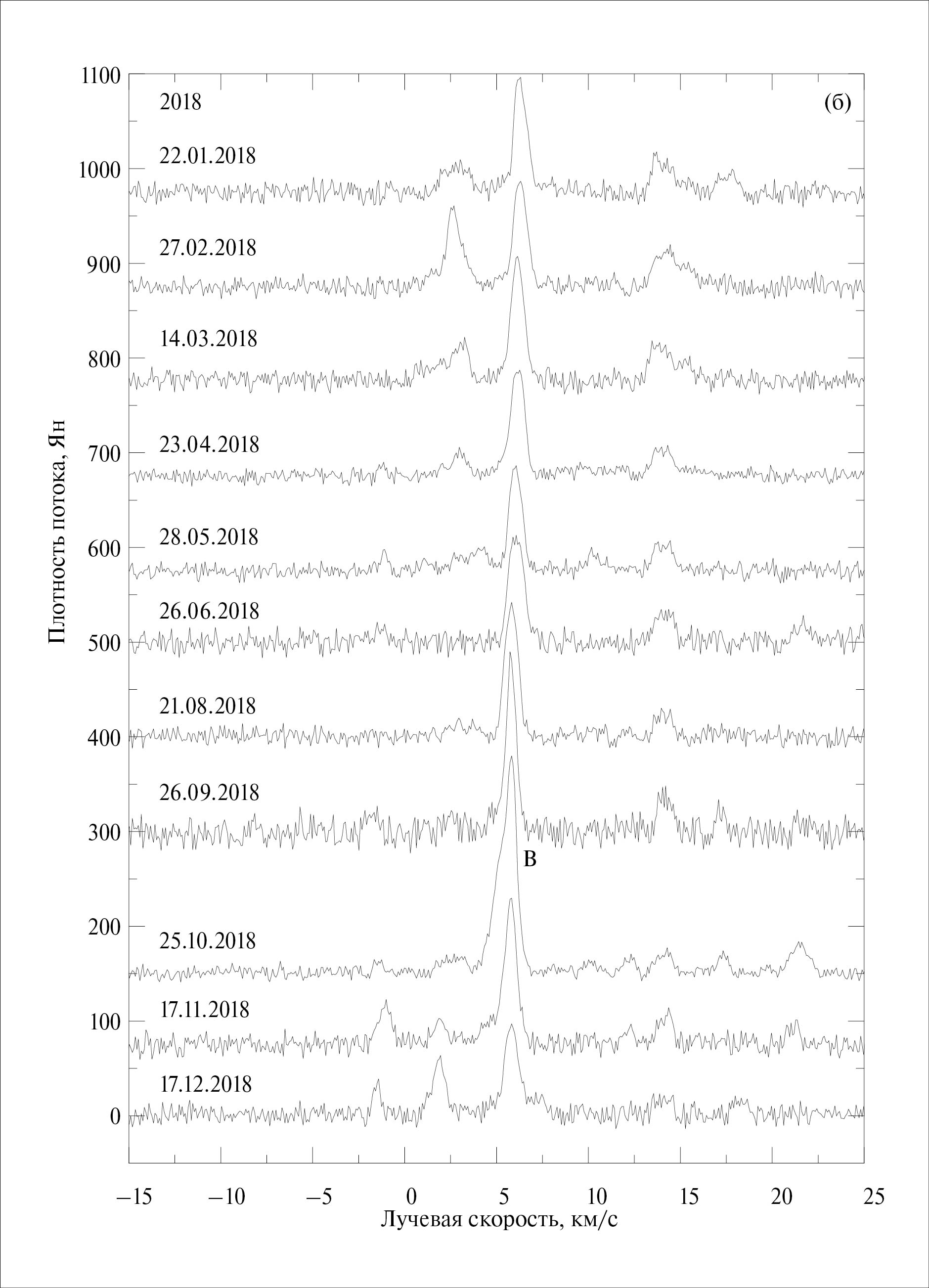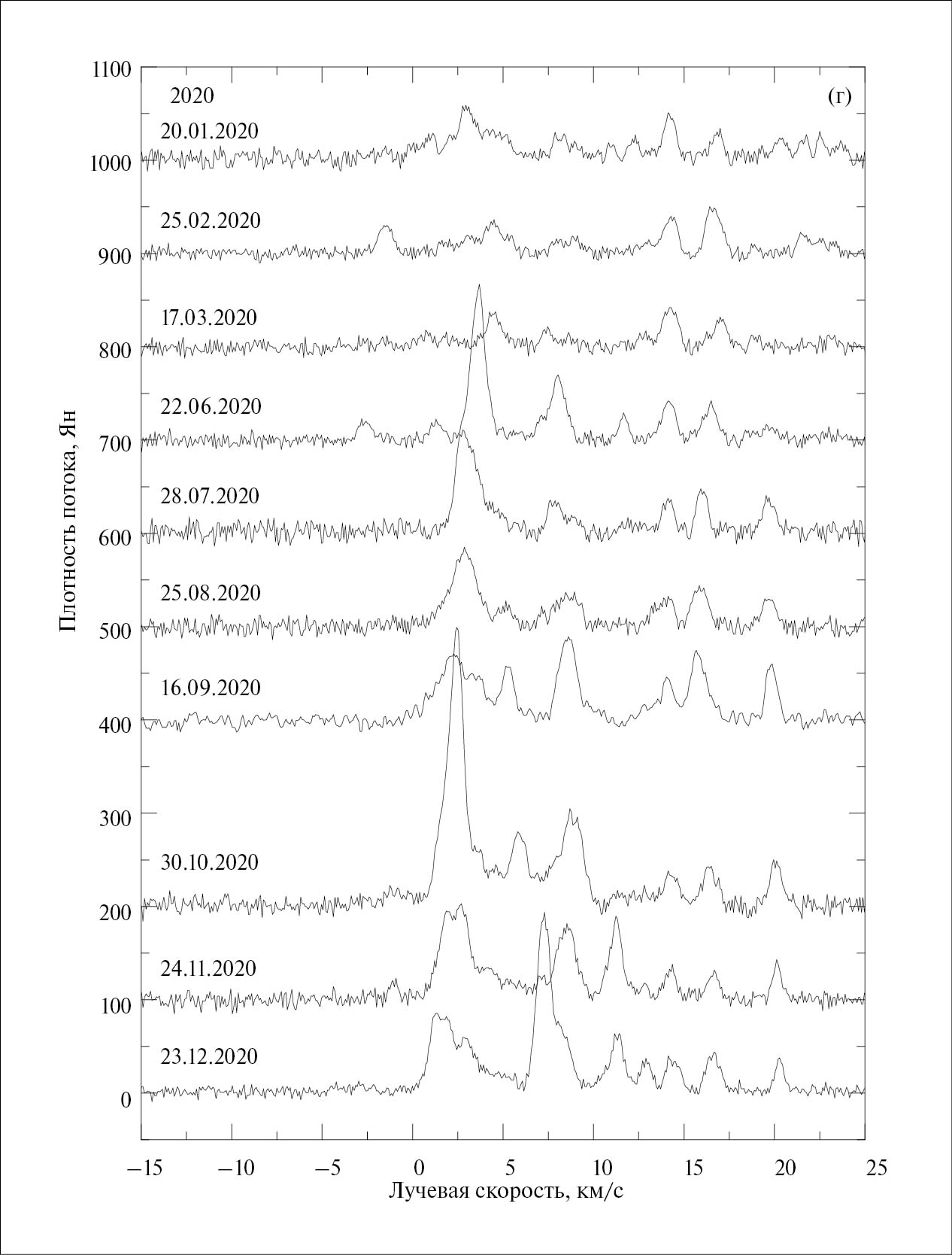 Регистрация сигнала осуществлялась 2048-канальным автокорреляционным приемником с разрешением 0.0822 км/с по лучевой скорости. Точность определения лучевой скорости находилась в пределах 20–25 м/с. Интервалы между сеансами наблюдений составляли в основном около одного месяца. Однако, когда происходили сильные вспышки, то в пределах одного сеанса (3–4 дня) мы проводили несколько наблюдений.