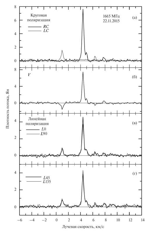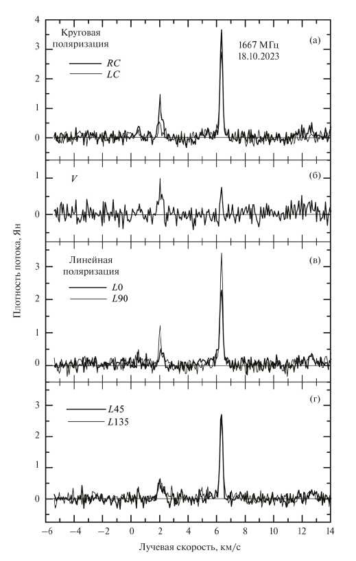 Излучение в линии гидроксила в S255 IR по наблюдениям в 2008 г. не было обнаружено с верхним пределом около 0.1 Ян. Результаты наблюдений OH в 2015, 2023 и 2024 гг. в главных линиях 1665 и 1667 МГц представлены на рис. 10–12 и 13–15 соответственно. На верхних панелях (а) показаны спектры в круговых поляризациях. На панелях (б) представлен параметр Стокса V, определяемый как разность излучения в правой и левой круговых поляризациях. При регистрации линейной поляризации сначала принимается сигнал из двух ортогональных направлений 0° и 90° (панели в), а затем после поворота облучателя антенны на 45° из направлений 45° и 135° (панели г).