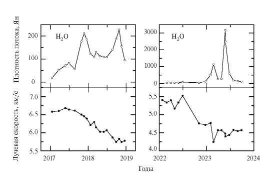 Настоящая работа посвящена исследованию вспышек в период 2017–2023 гг. Полный каталог спектров и результаты их анализа будут опубликованы в нашей последующей работе по S255 IR. Временной интервал 2017–2023 гг. в настоящей работе был выбран по двум причинам. Во-первых, в какой-то степени наши исследования являются ответом на поставленные в [14] вопросы (например, причина отсутствия внезапного и сильного увеличения интенсивности мазера H2O после вспышки аккреции в 2015 г.). Во-вторых, в этот период имел место существенный рост интегрального потока и происходили самые сильные вспышки мазерного излучения водяного пара за все время нашего мониторинга этого источника. Мы не приводим здесь данные нашего мониторинга за 2015–2016 гг., потому что спектры за этот период были опубликованы в работе Хирото и др. [14]. В анонсируемой работе все спектры будут приведены.