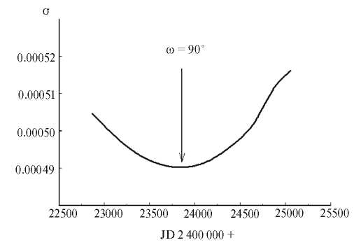 Рис. 7. Ход остаточных уклонений O – C моментов минимумов в наилучшей модели апсидального вращения при разных значениях начальной эпохи, за которую принимается значение долготы периастра ω = 90°. Минимуму невязок соответствует дата JD 2 423 857