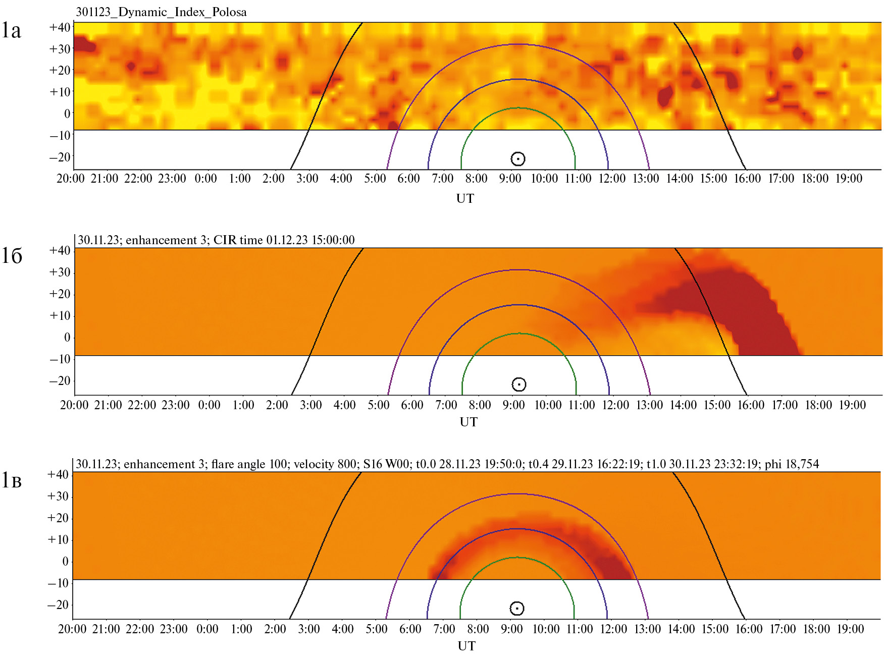 Кроме того, на рис. 1в для сравнения приведена модельная карта для коронального выброса массы (КВМ) после вспышки M9.8 28 ноября, который при скорости распространения около 800 км/с должен был прийти на Землю в момент начала возмущения магнитосферы 1 декабря в 0:00 UT. Подробнее использовавшаяся модель КВМ описана в работе [12].