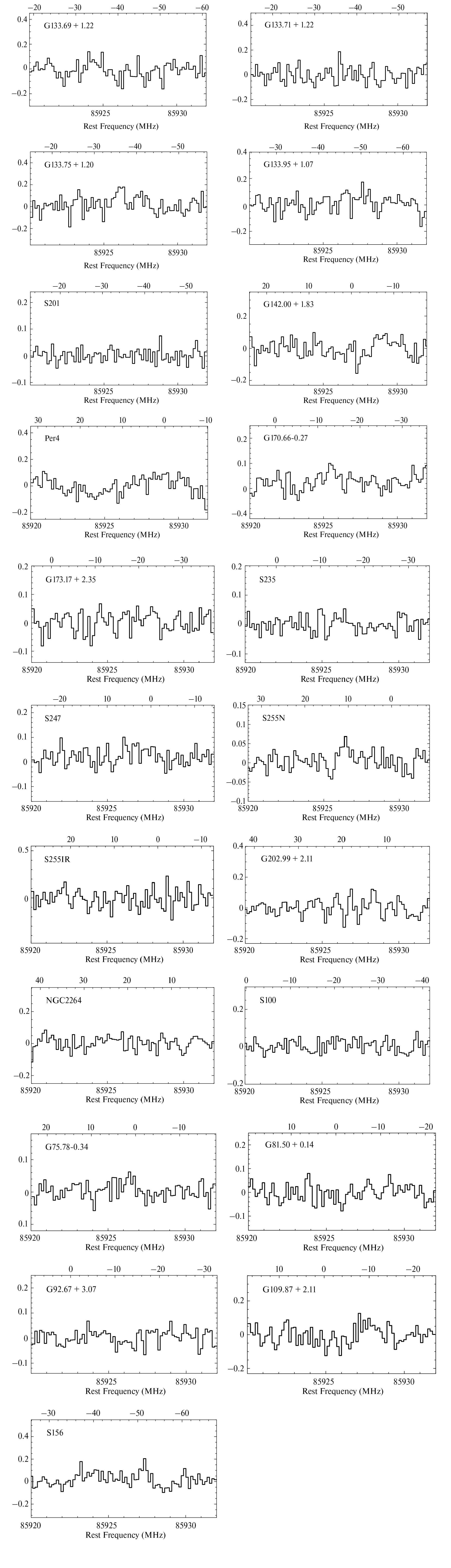 Рис. 2. Спектры источников, где линии NH 2 D не были зарегистрированы. Верхняя шкала на рисунках показывает V LSR в км/с.