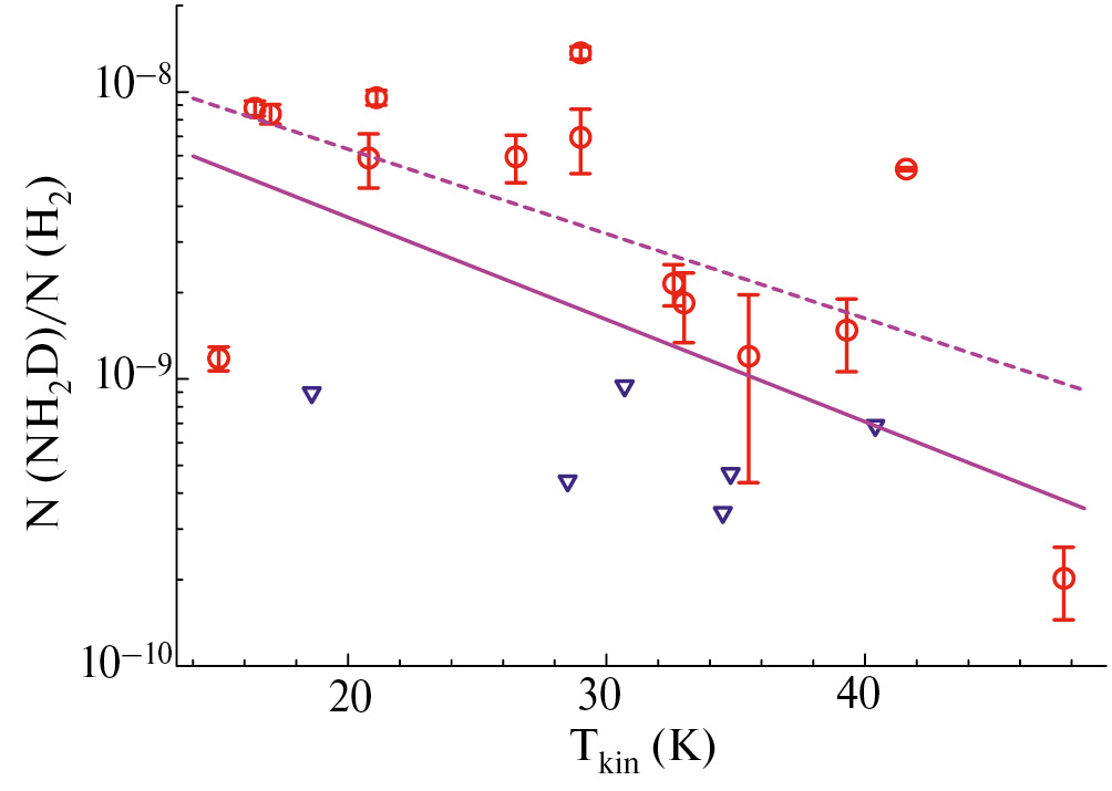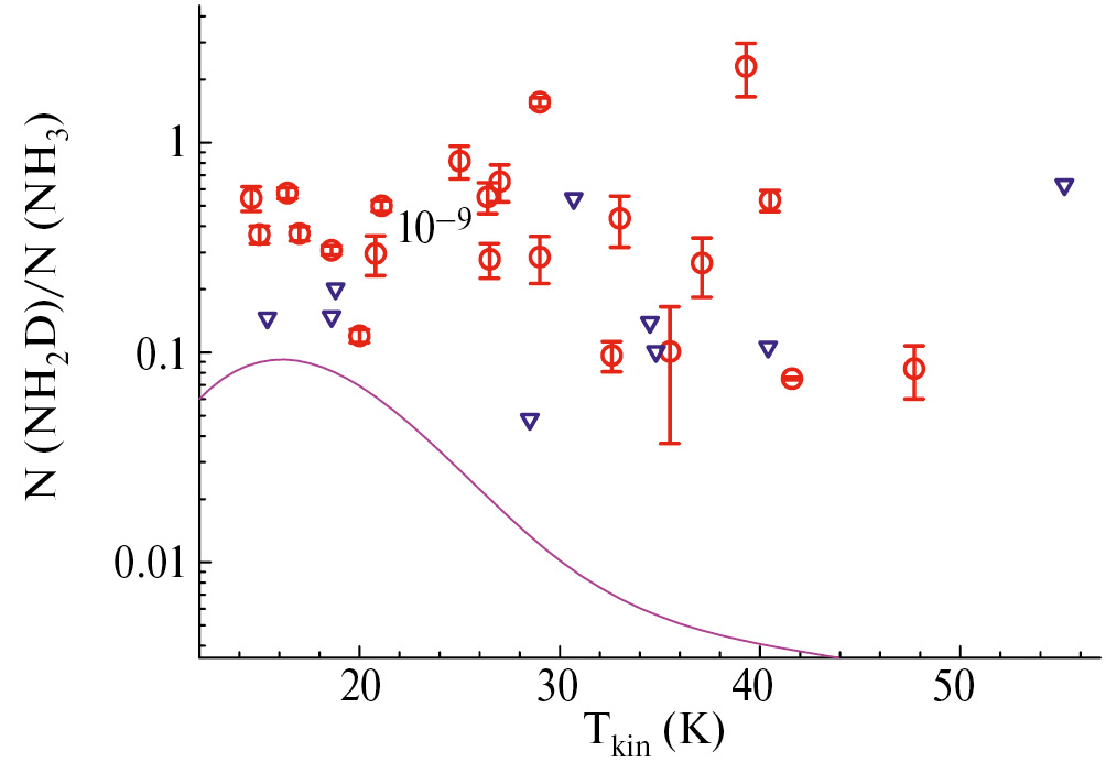 Рис. 6. Зависимость отношения лучевых концентраций однократно дейтерированного ммиака NH 2 D и недейтерированной фракции NH 3 от кинетической температуры источника для плотности газа n = 10 4 см –3 . Кружки — измеренные значения, треугольники — пределы обнаружения NH 2 D. Кривая показывает модельную зависимость отношения N (NH 2 D)/ N (NH 3 ) от кинетической температуры источника T kin согласно работе [2].