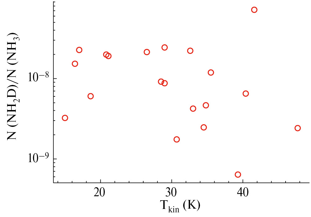 В работе [8] найдено, что частота детектирования NH 2 D в сгустках ATLASGAL понижается при температурах > 20 К. В принципе это согласуется с найденным нами уменьшением относительного содержания NH 2 D с ростом температуры. Зависимости отношения NH 2 D/NH 3 от температуры (в интервале 10–30 К) в работе [8], как и у нас, не обнаружено.