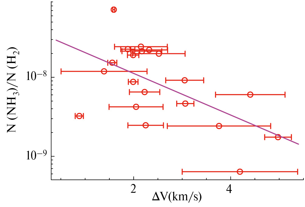 Что касается наблюдаемой тенденции к уменьшению относительного содержания аммиака с ростом кинетической температруры газа в источниках, а также его статистически значимого уменьшения с ростом дисперсии скоростей, то стоит отметить, что в работе [27] отмечалось уменьшение относительного содержания аммиака в направлении источников с наибольшей светимостью. Температура газа вокруг источников с высокой светимостью, как и турбулентность, естественно, также повышены. При этом значения относительной концентрации NH 3 при температурах К близки к типичным значениям [23].