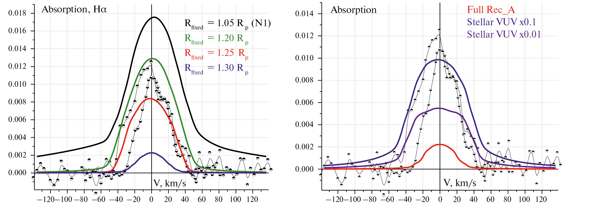 На рис. 6 (слева) показан профиль поглощения, полученный в моделировании с набором параметров N2 (красная кривая). Как видно, максимум поглощения достаточно близок к измеренному. Однако ширина профиля заметно больше ( FWHW =68 против 39 км/с), и наблюдается поглощение на крыльях линии, связанное с естественной шириной (профилем Лоренца). Отметим, что отрицательные ионы водорода заметно уменьшают крылья поглощения за счет поглощения в континууме, но не устраняют их полностью. В задаче имеются параметры, которые могут отклоняться от принятых величин: температура нижней атмосферы, содержание гелия и интенсивность излучения звезды в VUV диапазоне. На рис. 6 для сравнения приведены профили поглощения для разных значений этих параметров.
