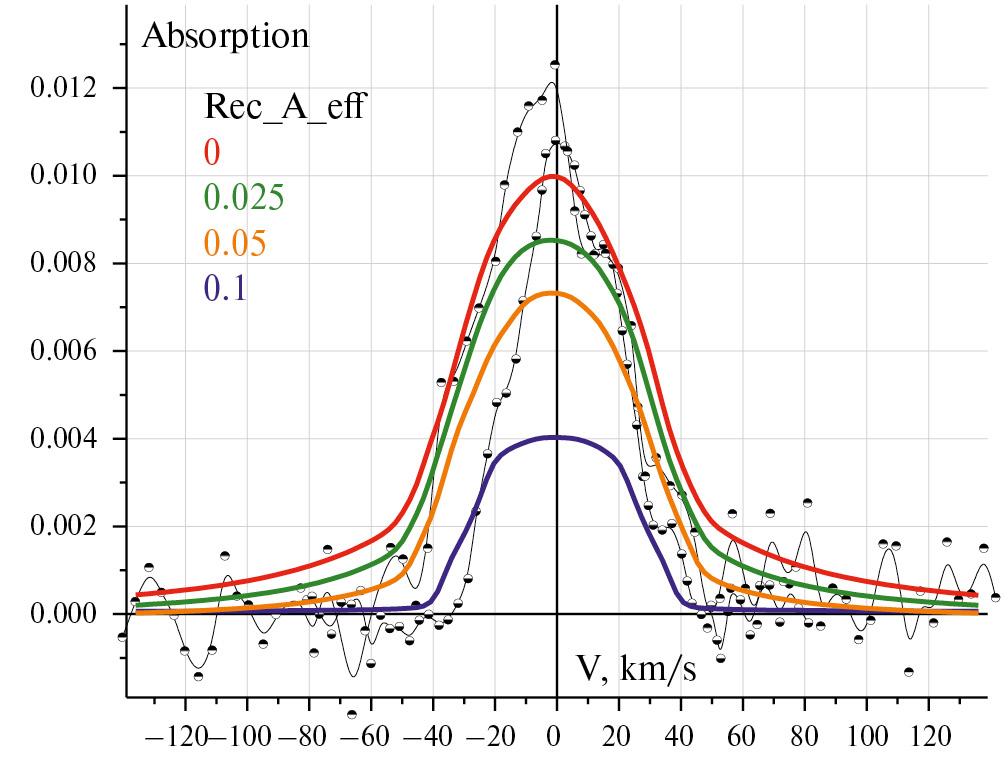 Для наглядности мы также показали поглощение в случаях, когда поток VUV излучения звезды значительно ниже, чем взятый в качестве предполагаемого. Видно, что глубина и ширина поглощения напрямую зависят от VUV потока, который обеспечивает фотоионизационный нагрев через состояние HI(n2). Кроме того, рисунок также показывает, что если предположить, что рекомбинация типа А в основное состояние не уменьшается в плотном газе, то населенность возбужденного водорода и результирующее поглощение в Hα окажутся гораздо меньше измеренных.