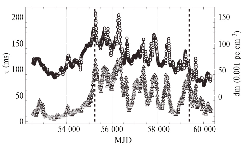 Полученные значения рассеяния ГИ τ сопоставлялись с вариациями меры дисперсии по оперативным данным мониторинга DM, публикуемого обсерваторией Джодрелл Бэнк (Великобритания) [2]. Зависимости τ и DM от времени приведены на рис. 2.