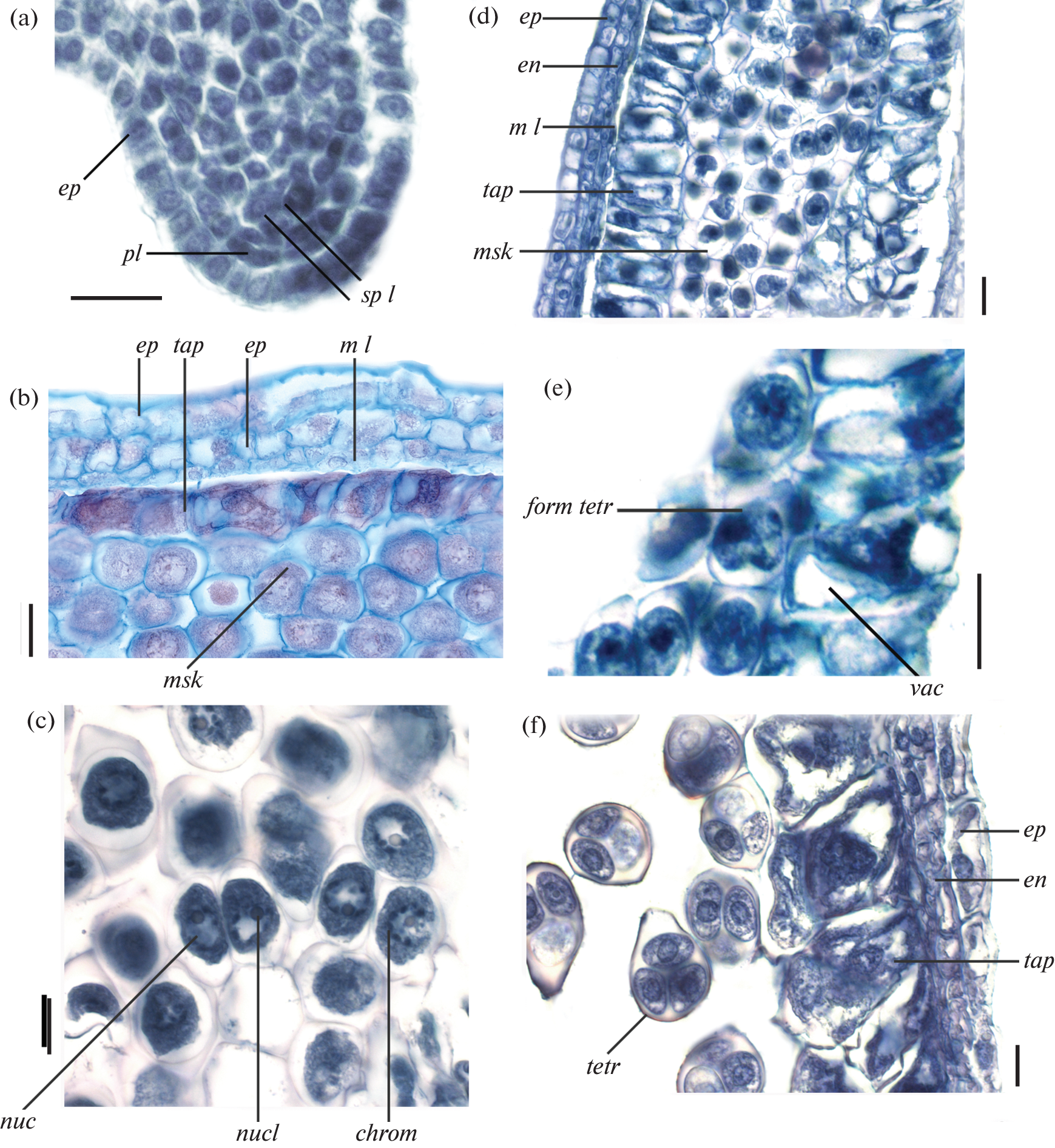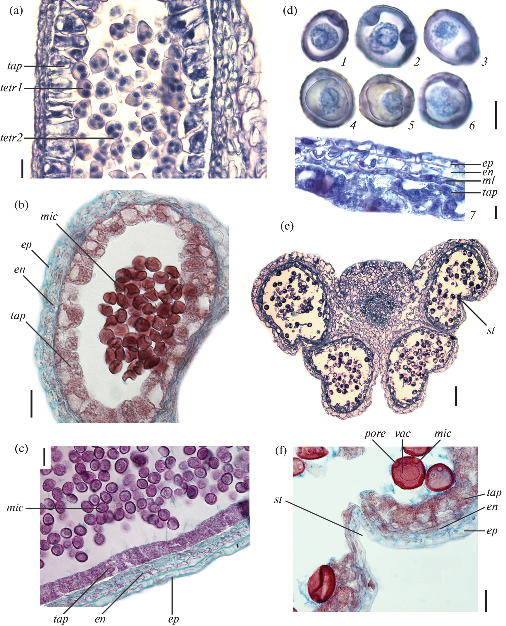 A cytoembryological study of the formation of microsporangium wall and the development of pollen grains in Campanula alliariifolia Willd. was carried out. A significant similarity in the structure of male embryonic structures in this species with the other representatives of Campanulaceae was revealed, namely: simultaneous formation of tetrads of microspores, bicellular pollen grains with relatively large vegetative cell, cellular secretory tapetum, bilayered endothecium. Characteristic features of this species are as follows: the absence of placentoids which indicates its evolutionary advancement, since the placentoids are characteristic of the most primitive representatives of the family; long-term, in comparison with previously studied species of the family, preservation of the tapetum, namely up to the opening of the anther, in the form of a cord of deformed tapetal cells located in a row and tightly adjacent to each other; relatively late appearance of fibrous bands.