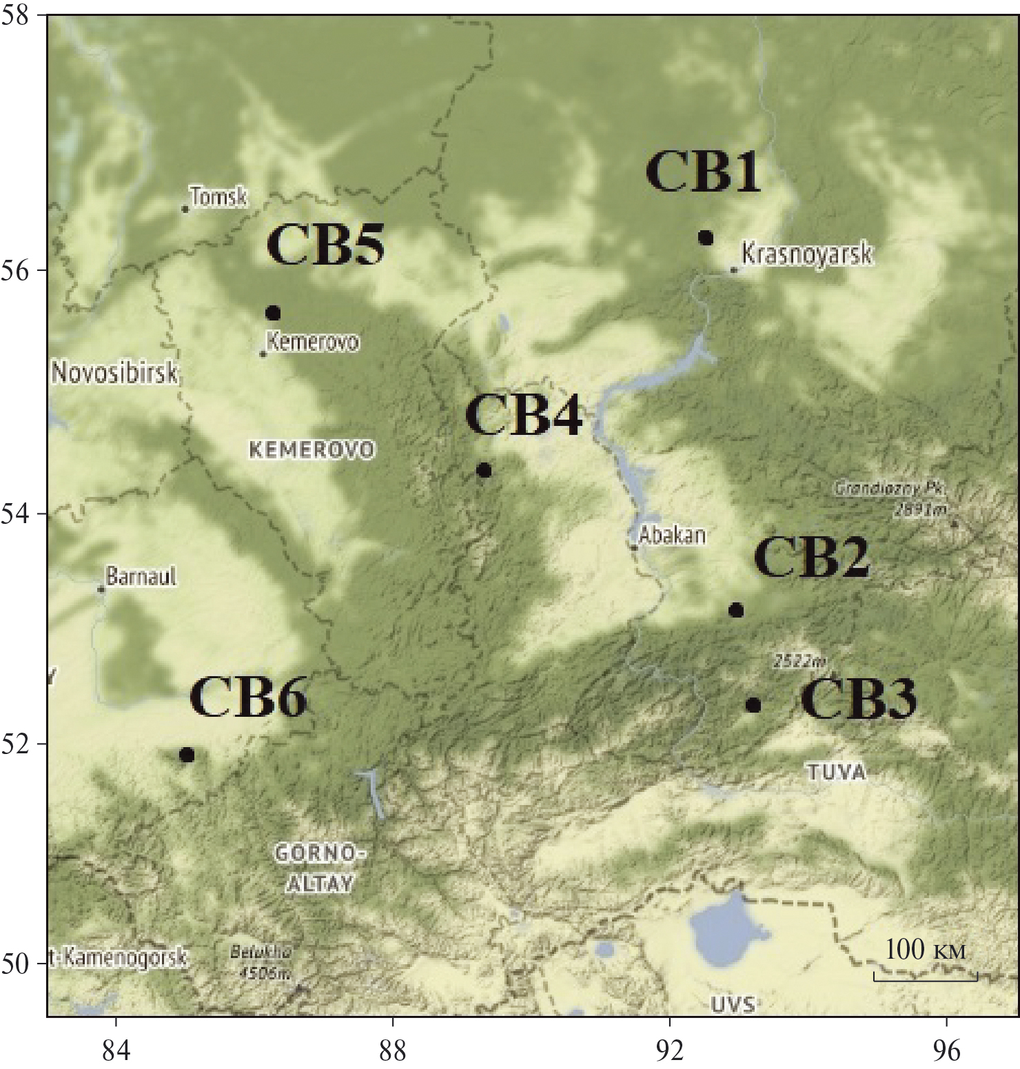 Местоположение Location | Красноярская лесостепь (Красноярский край) Krasnoyarsk forest-steppe (Krasnoyarsk Territory) | Западный Саян (Красноярский край) Western Sayan (Krasnoyarsk Territory) | Западный Саян (Красноярский край) Western Sayan (Krasnoyarsk Territory) | Кузнецкий Алатау (Республика Хакасия) Kuznetsk Alatau (Republic of Khakassia) | Кузнецкий Алатау (Кемеровская область) Kuznetsk Alatau (Kemerovo Region) | Алтай (Алтайский край) Altai (Altai Territory) |