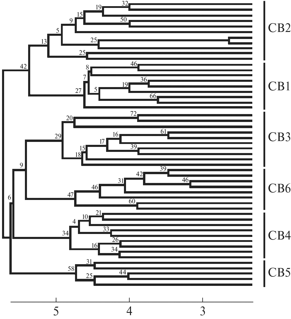 Число амплифицированных фрагментов ДНК, в зависимости от праймера, варьировало от 19 (HB12 и ISSR23) до 29 (ISSR17). Генное разнообразие Нея (He) в суммарной выборке составило 0.3331, индекс Шеннона (Io) – 0.4991. Уровень выявляемого внутрипопуляционного генетического разнообразия средний (47.19–65.17%). Показатели генетического полиморфизма максимальны для западносаянских популяций СВ2 (Р = 65.17%; He = 0.2337; Io = 0.3495) и CB3 (Р = 61.80%; He = 0.2187; Io = 0.3289). Минимальные значения отмечены для кемеровской CB5 (Р = 47.19%; He = 0.1888; Io = 0.2769) и алтайской CB6 (Р = 53.93%; He = 0.1854; Io = 0.2808) популяций. Коэффициент подразделенности популяций (Gst) составляет 0.3758. Таким образом, на долю межпопуляционного разнообразия приходится 37%, а изученные популяции демонстрируют очень высокую степень дифференциации согласно классификации С. Райта (Wright, 1978), что может указывать на присутствие в исследуемой выборке представителей разных видов.