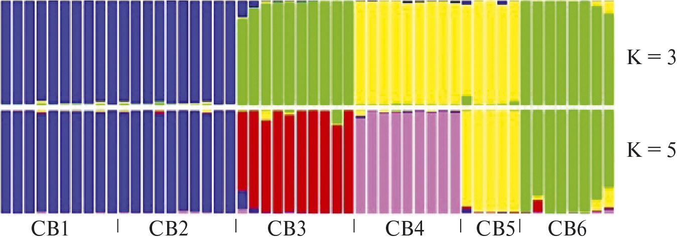 Анализ структуры распределения генотипов особей в программе STRUCTURE показывает, что исследуемые образцы максимально можно разделить на пять генетических кластеров (рис. 4). Основываясь на диаграмме вероятностей отнесения каждого образца к пяти кластерам, можно достоверно объединить популяции CB1 и СВ2. Образование этой устойчивой группы свидетельствует о давнем относительно других популяций генетическом обособлении. Оставшиеся образцы дифференцируются в соответствии с принадлежностью к популяциям при К = 5.