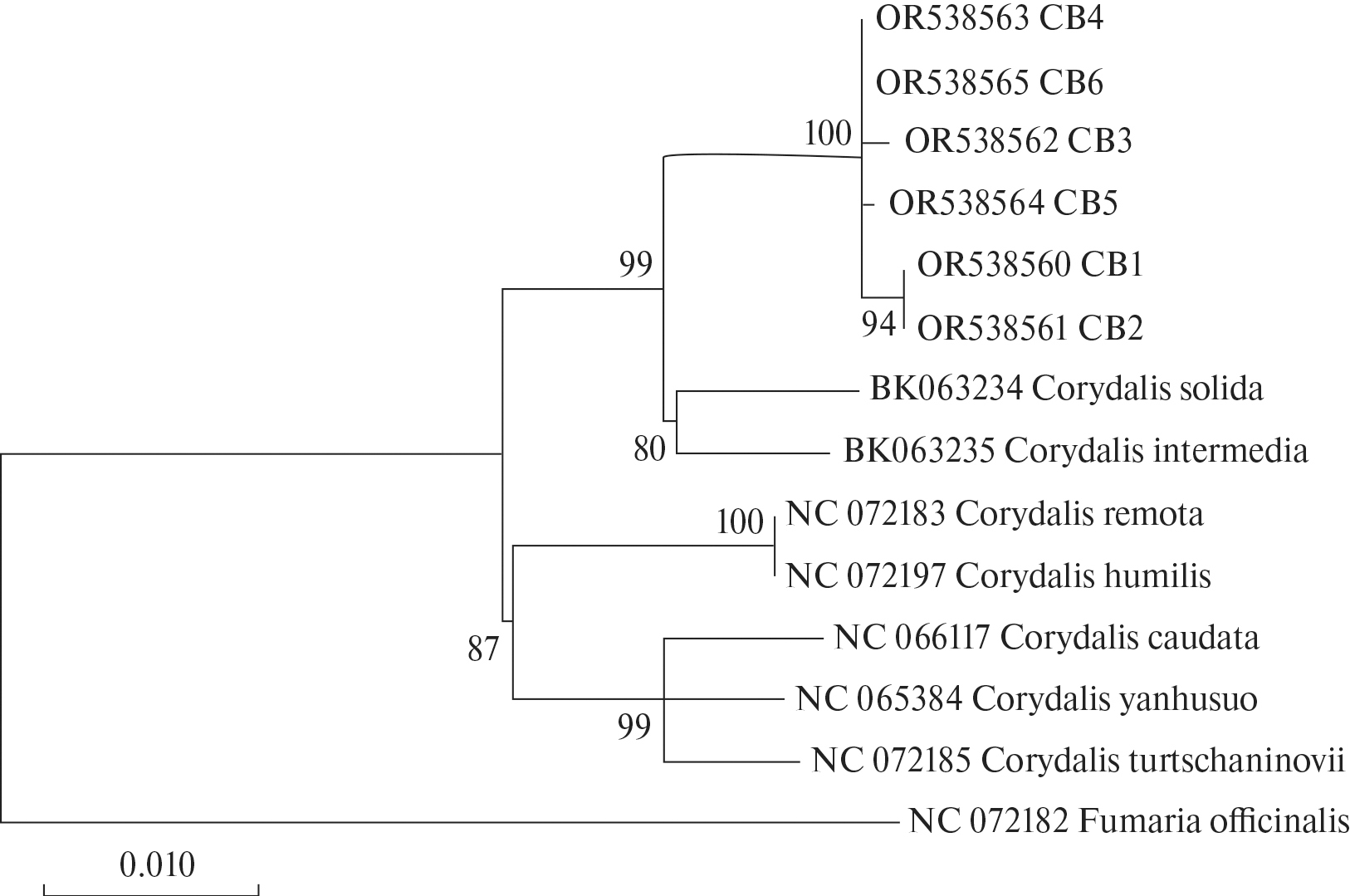 Следует отметить, что секвенирование участков хлоропластной ДНК (ген matK, спейсер rpoB-trnC) С. bracteata было проведено нами впервые. Наряду с данными последовательностями для филогении рода Corydalis другими авторами используются гены rbcL, trnG и межгенные спейсеры: trnL-trnF, psbA-trnH (Ren et al., 2019; Peng et al., 2023). Несмотря на то что участок ITS во многих исследованиях является эталонным маркером и зачастую используется для уточнения классификации семенных растений, для рода Corydalis он формирует противоречивую филогению ввиду своей мультикопийности (Jiang et al., 2018).