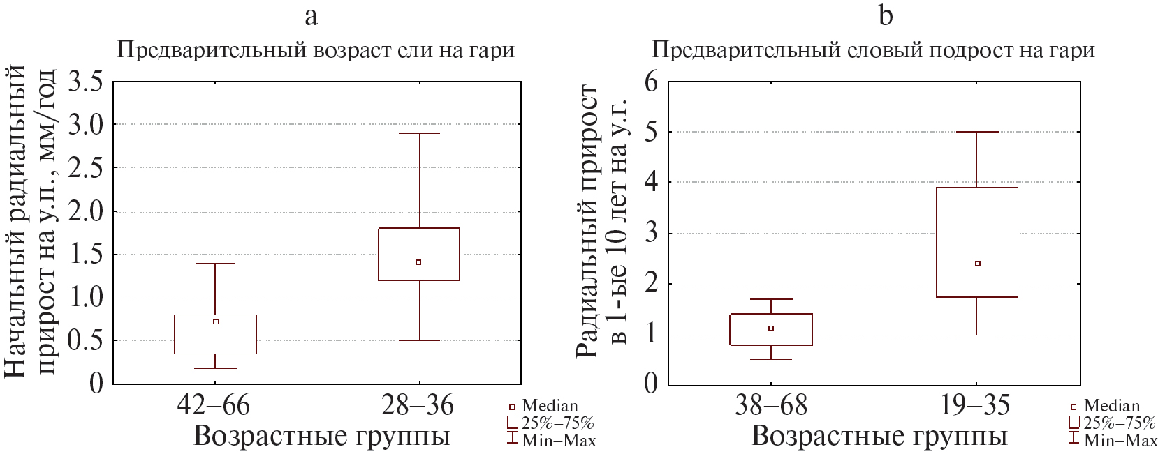 Рис. 4. Сравнение начальных радиальных приростов на у.п. (а) и на у.г. (b) елей старшей и младшей возрастных групп предварительного подроста на гари.