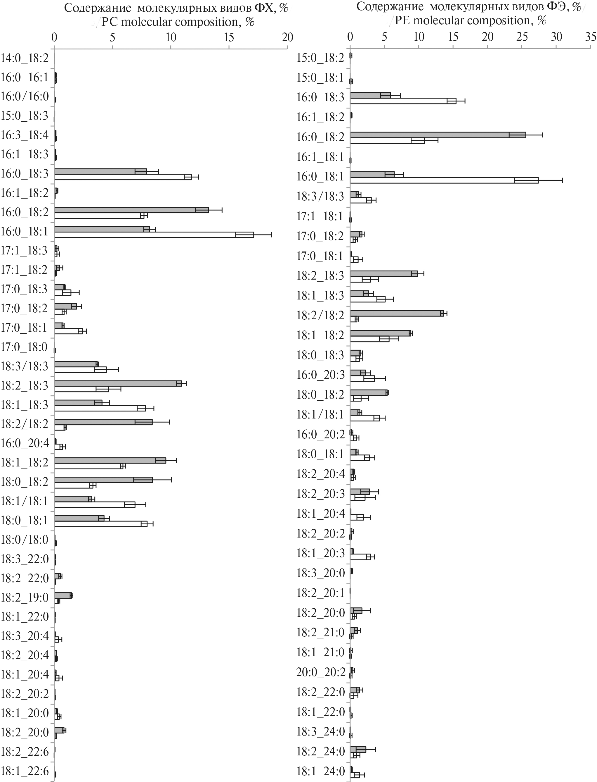Рис. 1. Состав молекулярных форм фосфолипидов Cycas revoluta (серые столбцы) и С. rumphii (белые столбцы). Эксперимент проведен в трех повторностях (n = 3), бары обозначают стандартное отклонение.