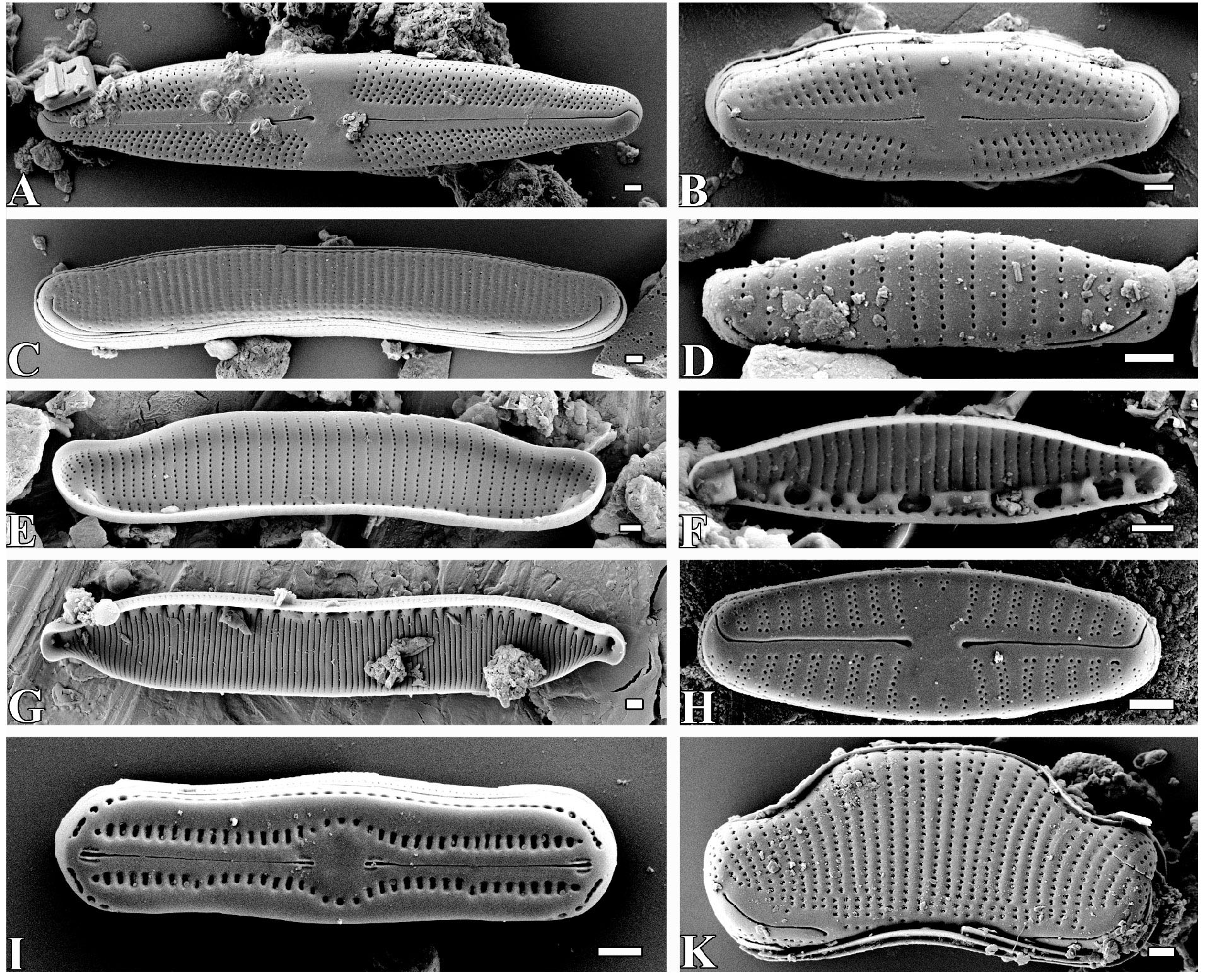 Fig. 2. A, B – Stauroneis borrichii; C – Eunotia botuliformis; D – Eunotia rhomboidea; E – Eunotia palatina; F – Nitzschia fonticola; G – Hantzschia amphioxys; H –Sellaphora saugerresii; I – Humidophila arcuata; K – Eunotia curtagrunowii