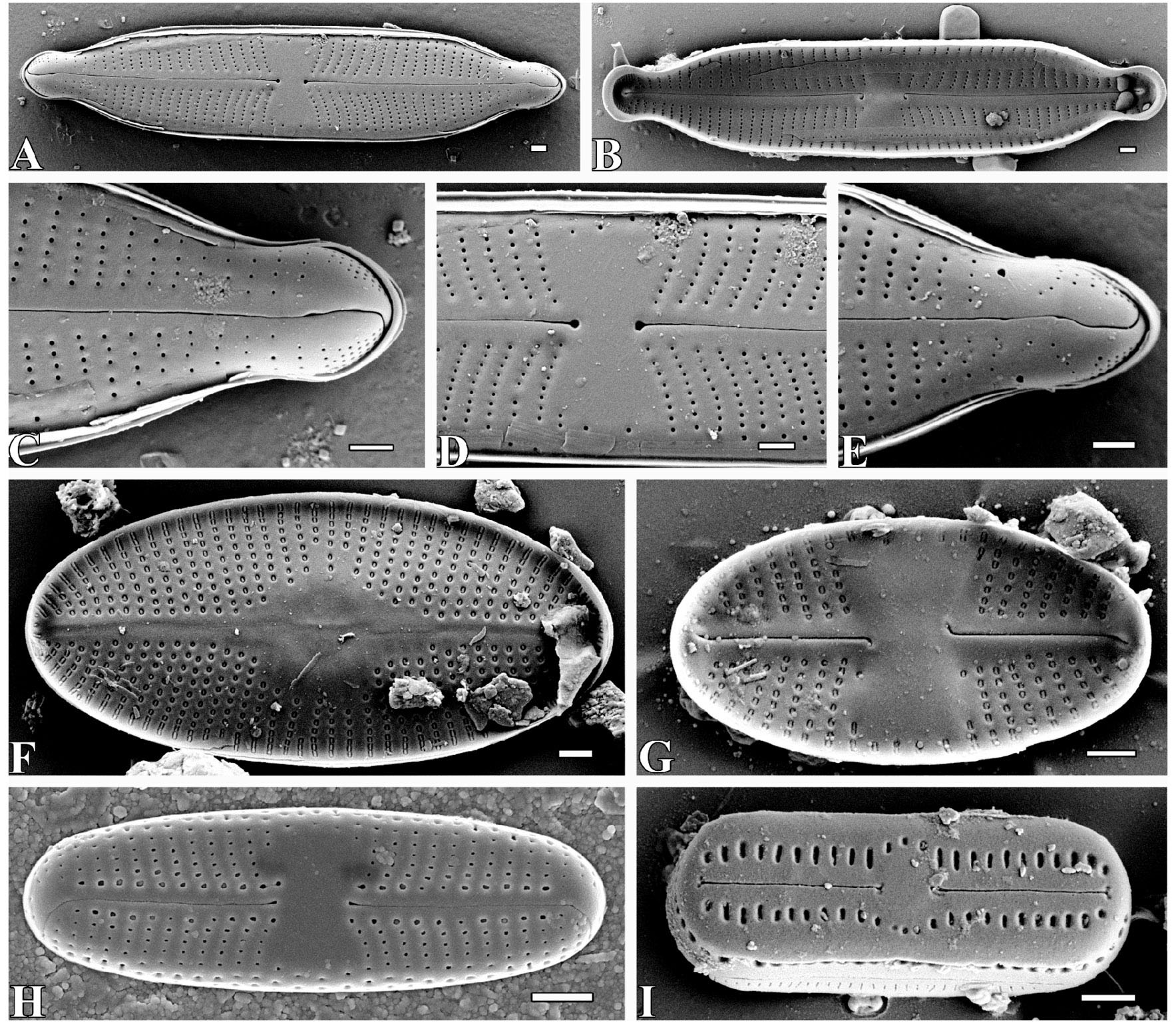 Рис. 3. A–E – Gomphonema reichardtii; F – Psammothidium lacustre; G – Psammothidium acidoclinatum; H – Sellaphora atomoides; I – Humidophila sceppacuerciae. С, E – окончания створки; D – центральная область створки. Шкала: 1 мкм