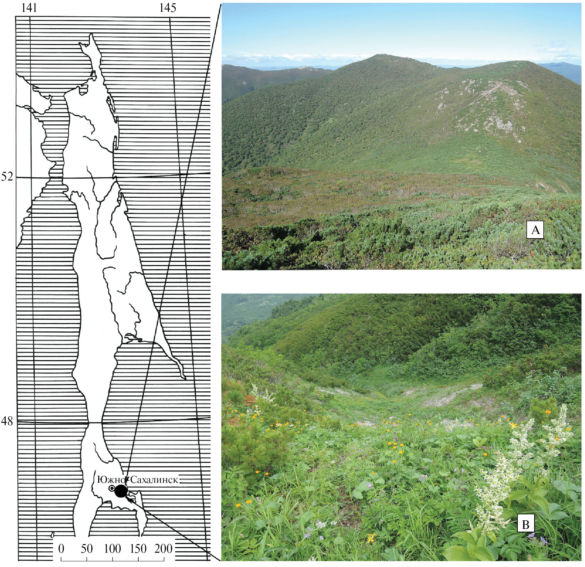 Рис. 1. Карта-схема острова Сахалин: месторасположение Майорского горного массива отмечено черным кружком; A – седловина между горами Высокая и Майорская; B – разнотравная лужайка на выходах серпентинитов в верховье горного ручья