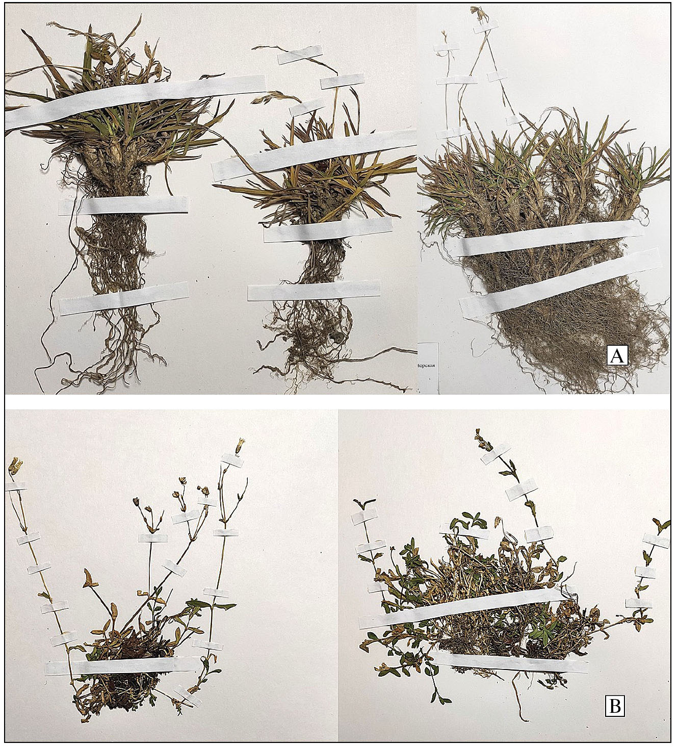 Рис. 2. Фрагменты гербарных образцов Poa sugawarae (A) и Cerastium sugawarae (B) в поздней фазе развития из locus classicus: “Сахалин, Сусунайский хребет, седловина между горами Высокая и Майорская, 46°54´39.5´´ с. ш., 142°55´20.7´´ в. д., на серпентинитовой осыпи, 14 IX 2021, В.В. Шейко” (VLA)