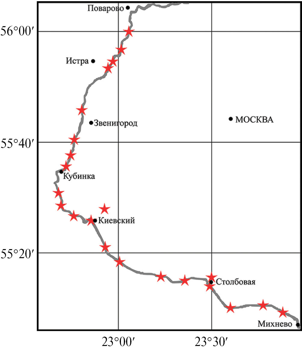 Ниже перечислены местонахождения R. procerus по железным дорогам в пределах Средней России, подтвержденные гербарными сборами (имеется один образец из Тульской обл.). Для сборов автора приведены идентификаторы iNat, соответствующие номерам наблюдений с фотоматериалами на iNaturalist.org. Более подробно (с учетом точек, подтвержденных только фотографическими материалами, позволяющими установить видовую принадлежность) современное распространение ежевики в Москве и Московской области показано на схеме (рис. 3).