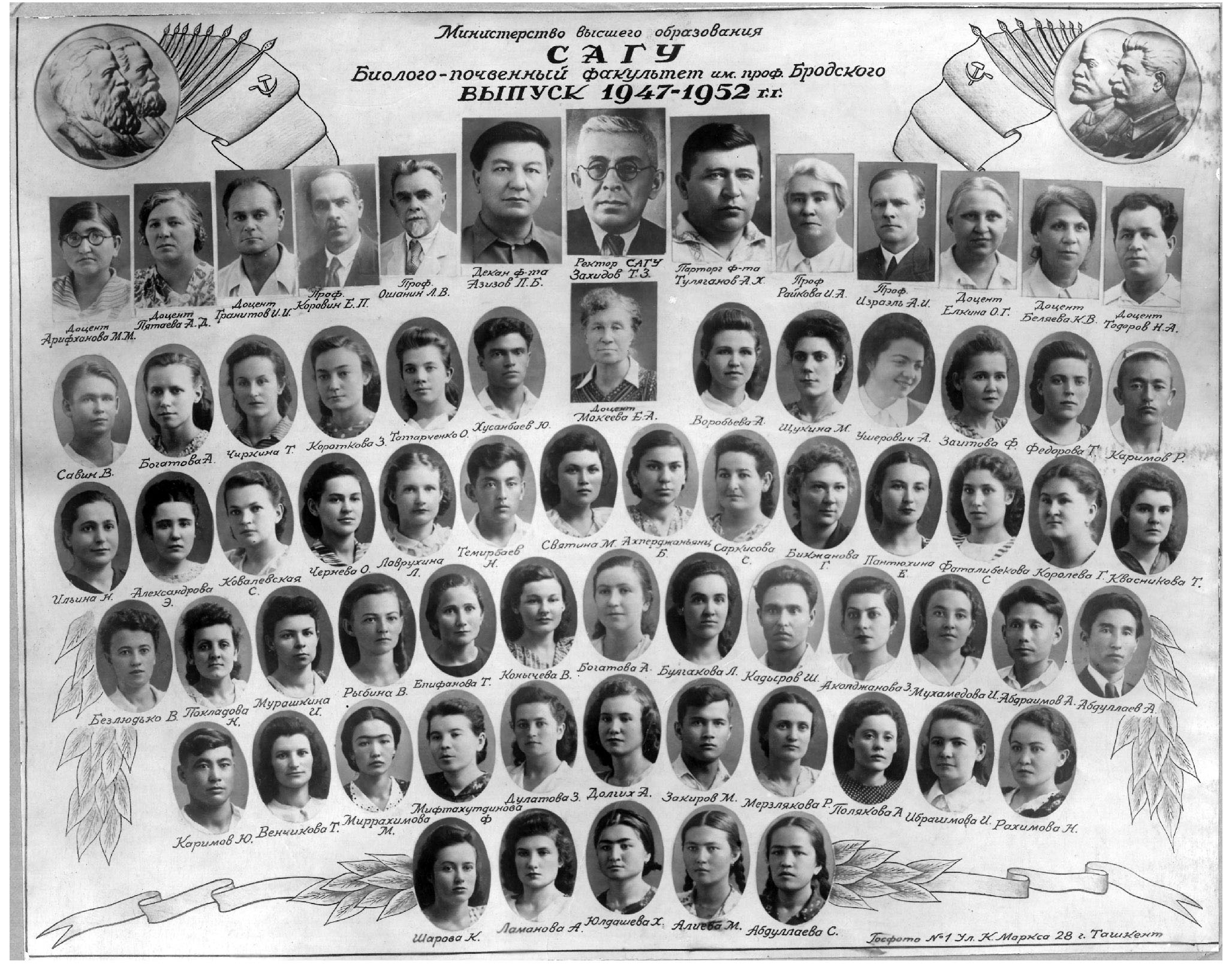 Graduate of the Biology and Soil Faculty of the Central Asian State University (SAGU) of 1947–1952. O.V. Tscherneva in the third row from above, fourth from the left