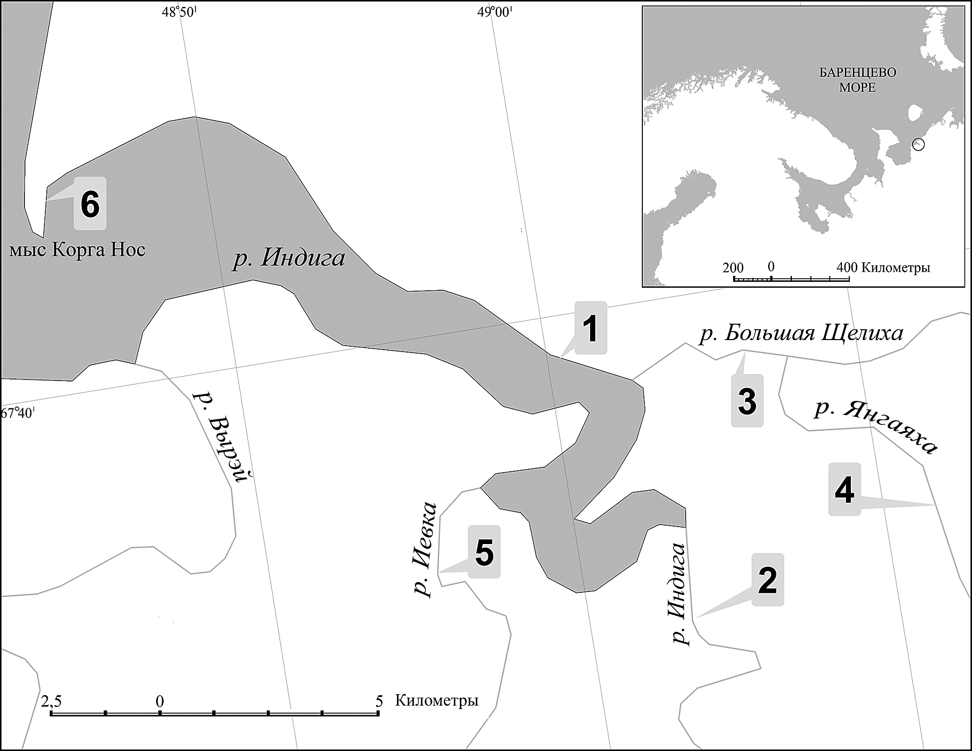На карте обозначены местоположения: 1 – устье р. Индиги (67°39'19.47" с. ш. 49°1'40.23" в. д.), 2 – вершина устья р. Индиги (67°36'25.95" с. ш. 49°4'22.86" в. д.), 3 – устье р. Большая Щелиха (67°39'19.47"с. ш. 49°3'27.40" в. д.), 4 – устье р. Янгаяха (67°38'40.17" с. ш. 49°5'18.60" в. д.), 5 – устье р. Иевки (67°38'0.99" с. ш. 48°56'15.10" в. д.), 6 – мыс Корга-Нос (67°42'8.18" с. ш. 48°44'31.88" в. д.).