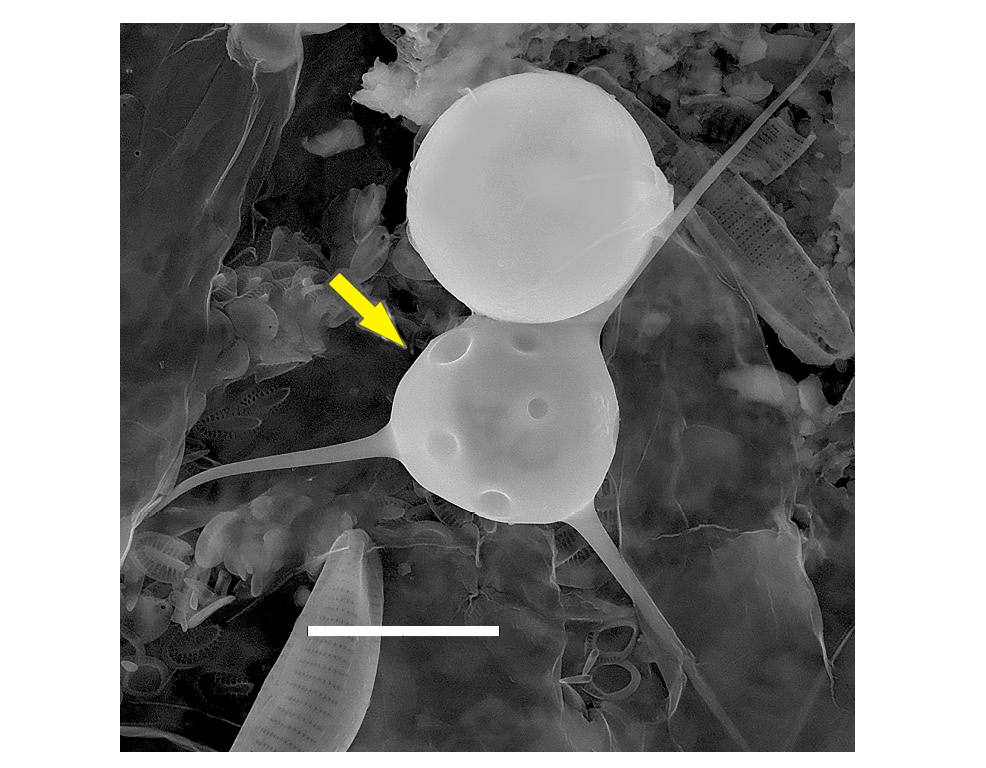 Рис. 1. Вегетативная клетка Chrysococcus furcatus (СЭМ) из Тесьминского водохранилища 18.05.2020. Вегетативная клетка указана стрелкой. Масштабная линейка – 10 мкм.