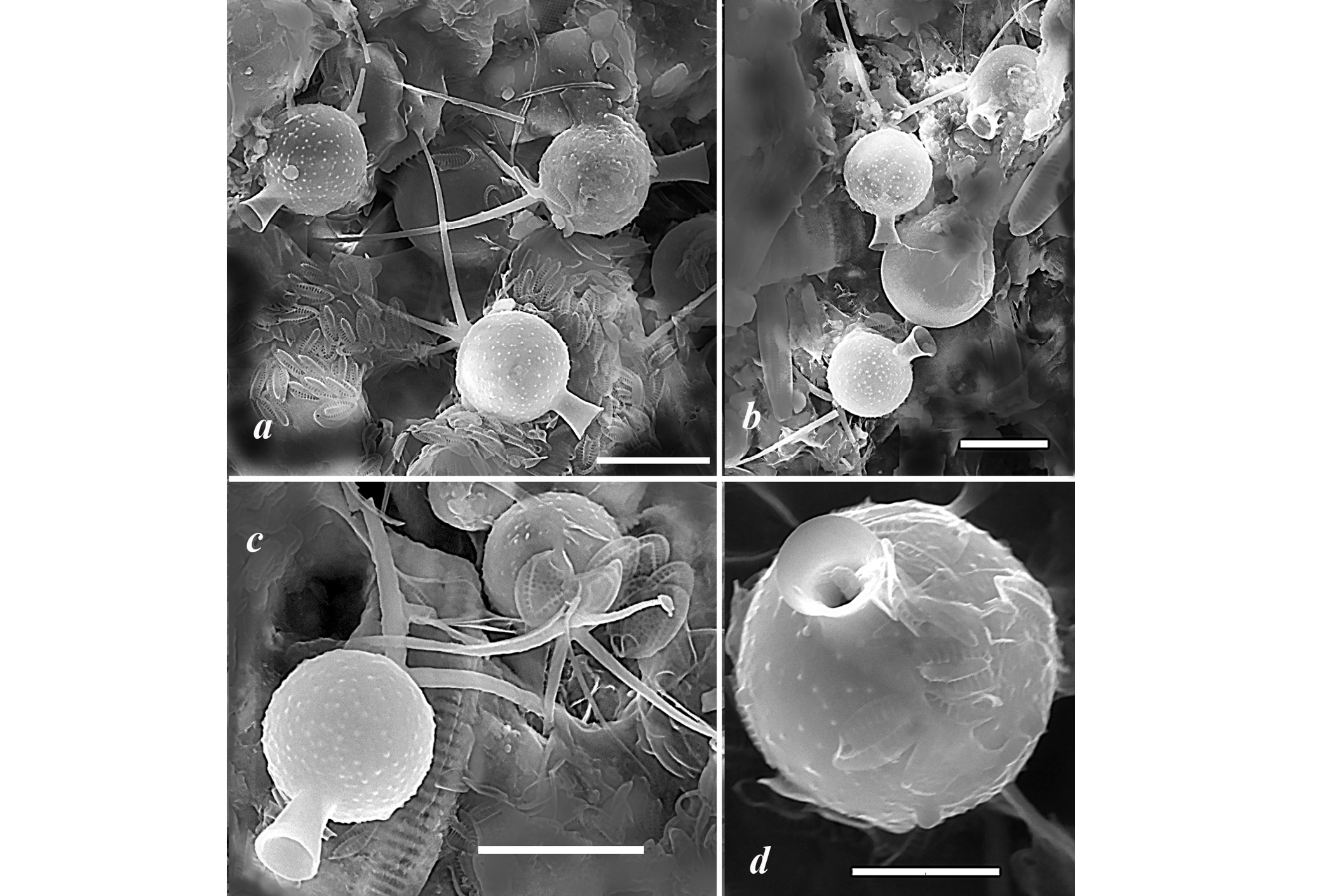 Рис. 3. Популяция стоматоцист Chrysococcus furcatus (СЭМ) в Тесьминском водохранилище 13.05.2020: а, b – стоматоцисты с 3 шипами на заднем полюсе, орнаментированные нерегулярно распределенными коническими выростами; c – стоматоциста с 4 шипами на заднем полюсе; d – стоматоциста, диаметр отверстия внутри воротничка 1 мкм. Масштабная линейка: a, b, c – 10 мкм; d – 5 мкм.