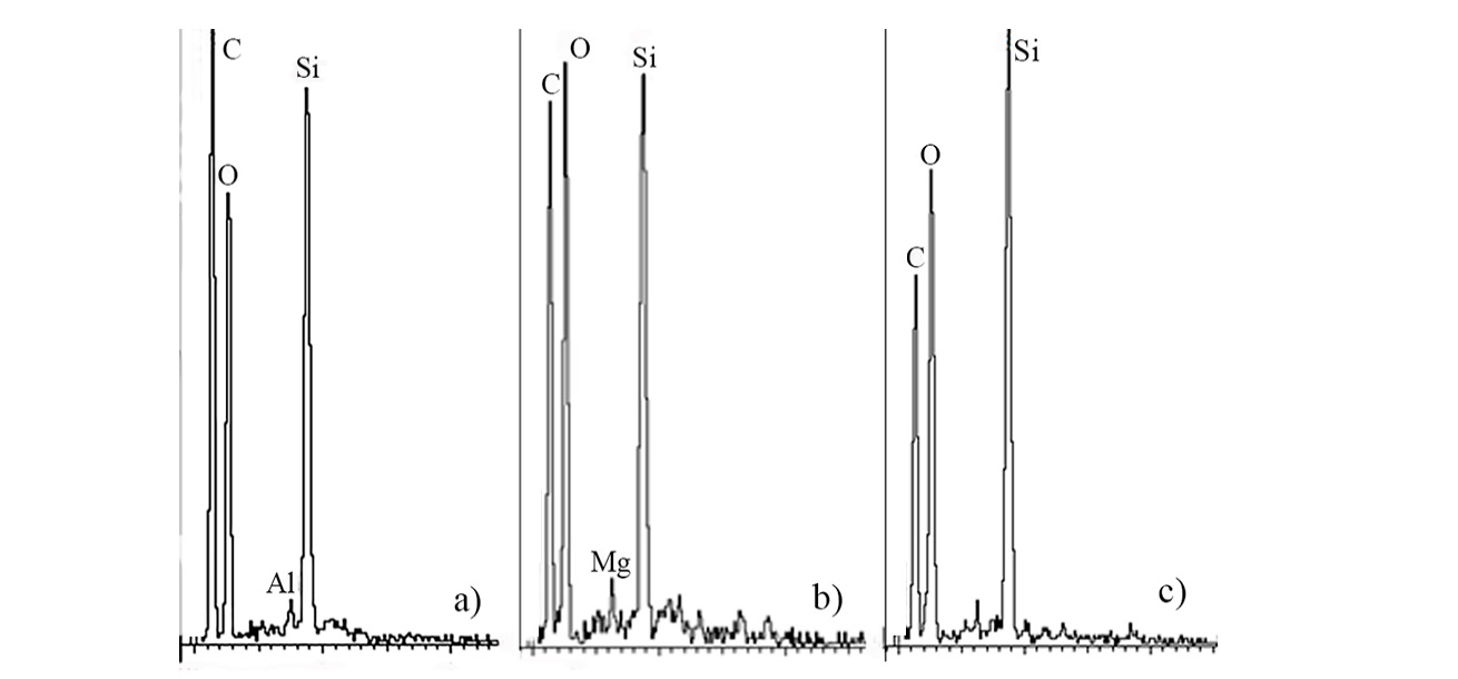 Фрагменты спектрограмм незрелых стоматоцист новой формы с тремя игольчатыми шипами, интерпретируемой как менее зрелая, чем циста с бифуркатным шипом, показали заметное содержания аллюминия, магния (Al, Mg) в оболочке (рис. 4a, b).