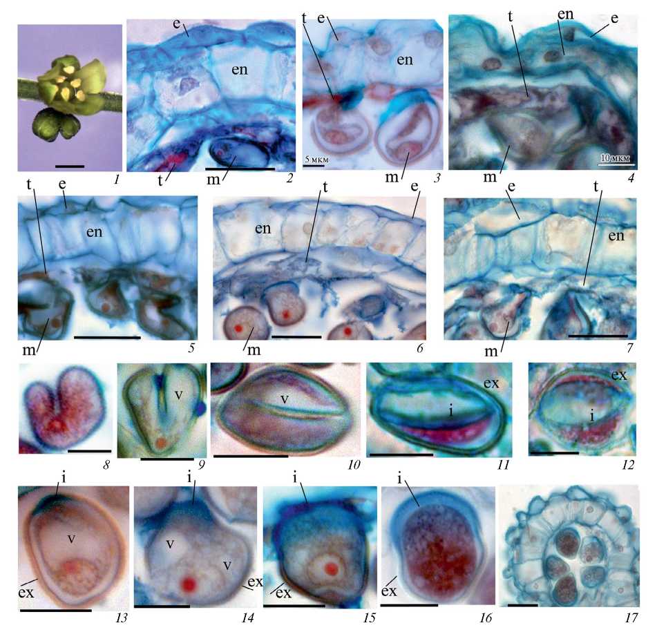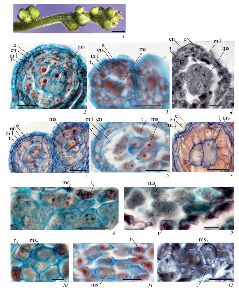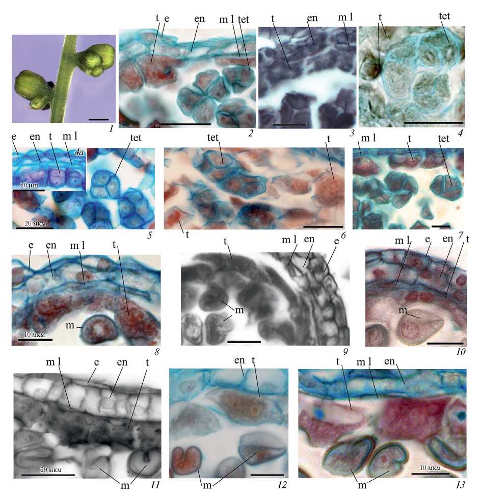 Формирование пыльников начинается в бутонах тычиночных цветков в начальный период бутонизации, когда размер бутонов не превышает 1 мм (рис. 1, 1), и проходит этапы примордиального развития с образованием эндотеция, среднего слоя и тапетума. Эти самые ранние этапы здесь не исследуются, описание начинается со стадии спорогенной ткани, когда стенка гнезд пыльника уже сформирована и у всех исследованных видов представлена четырьмя слоями одинаковых слабо вакуолизированных и тонкостенных клеток – эпидермисом, эндотецием, средним слоем и тапетумом.