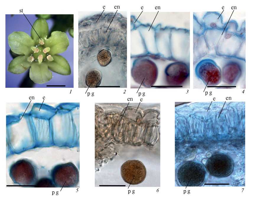 Стенка зрелого пыльника представлена эпидермисом и эндотецием. Эпидермис пыльника становится высокоспециализированной покровной тканью, эндотеций представлен крупными клетками с фиброзными утолщениями (рис. 4, 2–7).