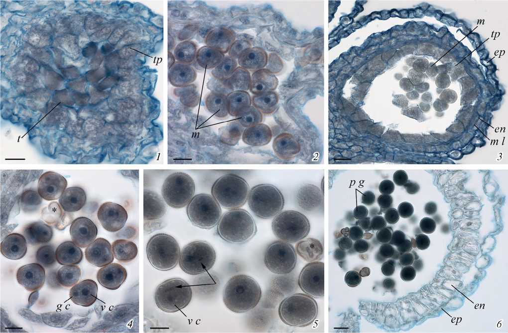 Fig. 2. Anther structure and male gametophyte development in Borodinia macrophylla: 1 – anther locule at the stage of meiosis in microsporocytes (4 nuclei are visible in one cell before the formation of cell walls); 2 – microspores; 3 – structure of the anther wall at the microspore stage; 4 – bicellular pollen grains; 5 – mature pollen grains, in some of them the division of the generative cell is visible (indicated by arrows); 6 – the structure of the wall of a mature anther.