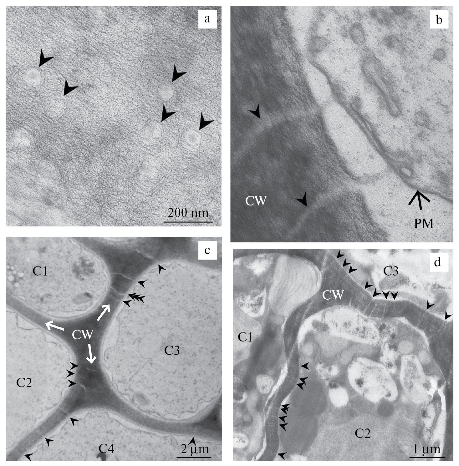 Рис. 2. Разрозненные плазмодесмы в клетках Chaetopteris plumosa: a. Поперечные срезы плазмодесм (обозначены стрелками); b. Продольные срезы плазмодесм (обозначены стрелками); c. Продольные срезы плазмодесм (обозначены стрелками) в клетках периферического слоя сердцевины; тройной стрелкой обозначена плазмодесма, которая выглядит разветвленной; d. Продольные срезы плазмодесм (обозначены стрелками) между центральными клетками сердцевины; CW – клеточная стенка; PM – плазматическая мембрана; C1, C2, C3, C4 – клетки на срезах.